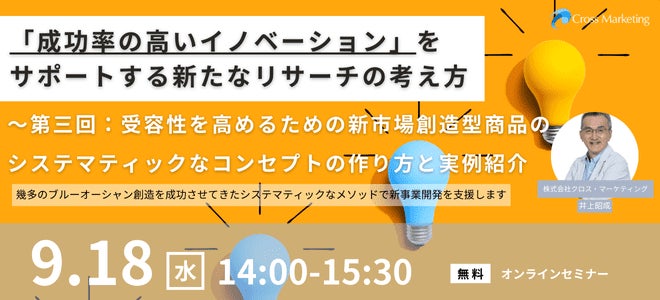 株式会社クロス・マーケティング(本社:東京都新宿区 代表取締役社長兼CEO:五十嵐 幹、以下当社)は、成功率の高いイノベーションをサポートする新たなリサーチの考え方「第3回受容性を高めるための新市場創造型商品の実例紹介」セミナーを9月18日(水)に開催いたします。