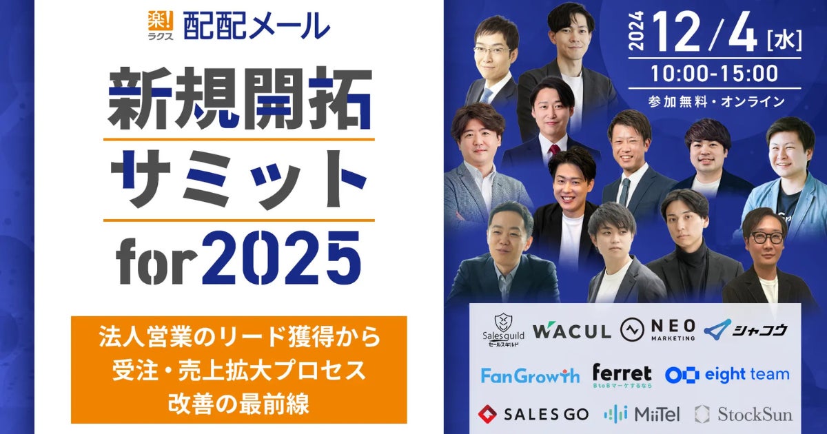 これらのお悩みを解決し、来る2025年に向けて売上拡大と効率的な営業プロセスを実現するアイデアを得られるよう各領域の専門家を集めた「新規開拓サミット for 2025」を開催いたします。
