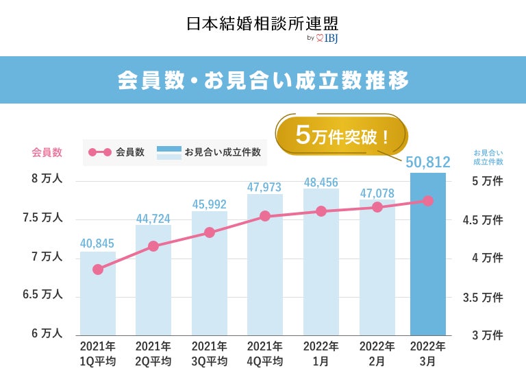 株式会社IBJ(代表取締役社⻑:⽯坂 茂、本社:東京都新宿区、東証プライム:6071)が運営する会員数・成婚数ナンバーワン*の結婚相談所ネットワーク「⽇本結婚相談所連盟」にて、2022年3月のお見合い成立件数が過去最多となる月間5万件を超えました。コロナ禍においても、会員数は増え続け、「成婚」の先行指標となるお見合いが活発化することで、今後の成婚数増加も期待されます。