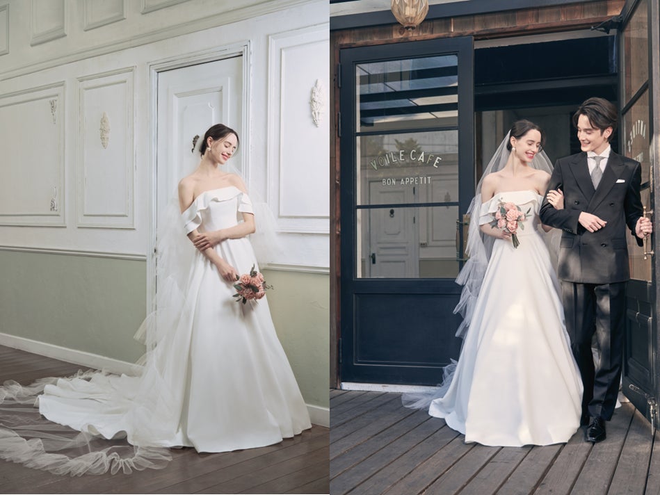 クレープサテン素材がつくりだす、 なめらかで落ち感のある美しいドレープ。上品なオフショルダーは腕や肩を華奢に魅せ、 女性ごころをくすぐるポイントに。ロングトレーンでバックショットもフォトジェニック。