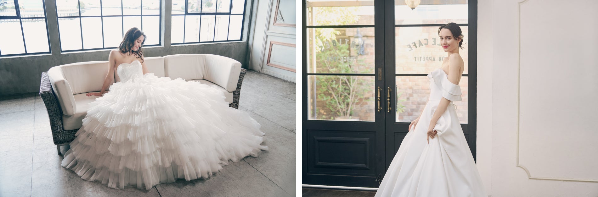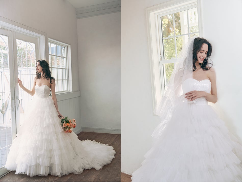今回の新作ウェディングドレスは2デザインが登場します。「BEAMS DESIGN White Star」は、何層にも重ねたティアードフリルスカートが、ふんわりとボリューム感たっぷりで、動きのあるシルエットが可憐なプリンセスラインのドレスです。胸元のビスチェには、スパンコールが一面に散りばめられ、光を受けてキラキラとはじけるように輝きます。「BEAMS DESIGN White Petal」は、クレープサテン素材がつくりだす、 なめらかで落ち感のあるドレープが美しいAラインのドレスです。オフショルダーは腕や肩を華奢に魅せ、ゆったりと長めの編上げリボンとロングトレーンがバックスタイルを上品に飾ります。