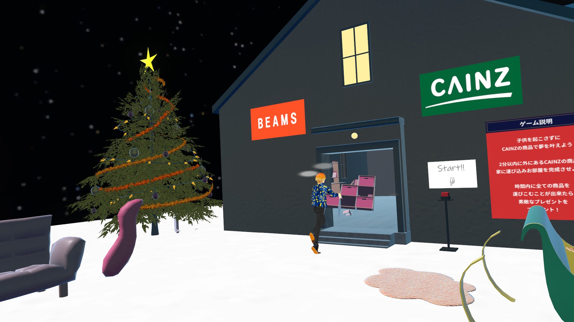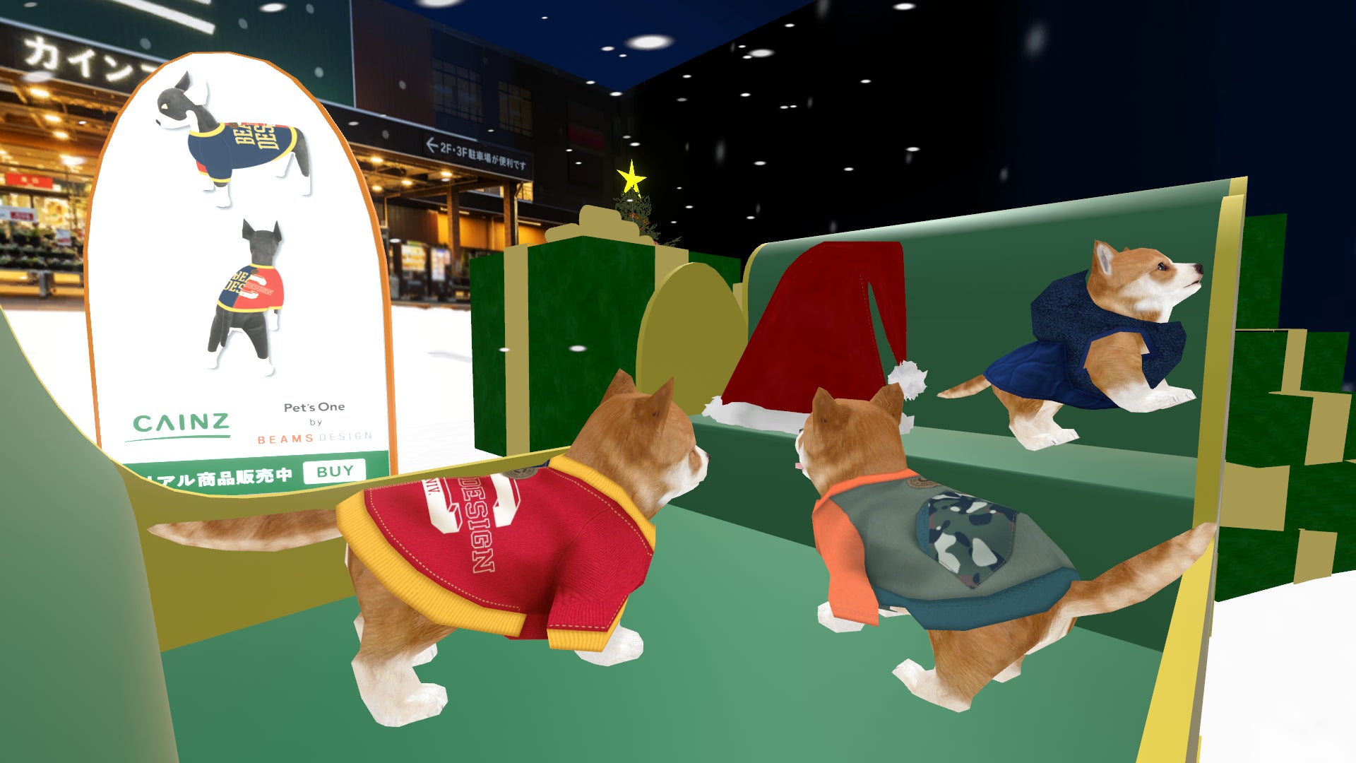 ショップ2階では、ホームセンター「カインズ」とのコラボレーションで、サンタに代わって子ども部屋を完成させる模様替えゲームを実施中。2分以内にチャレンジをクリアするともらえる、アバターに着用できる「バーチャル犬マスク」(デジタル賞品)が好評です。さらにSNSキャンペーンに参加するとカインズの商品が当たるチャンスも。カインズで販売中の、BEAMS DESIGNレーベルがプロデュースしたカインズ限定ペットウェア「Pet’s One by BEAMS DESIGN」を着た可愛いワンちゃんたちにもご注目ください。(SNSキャンペーンの詳細はバーチャルショップ内のバナーかTwitterの「@cainz_official」よりご確認いただけます。)