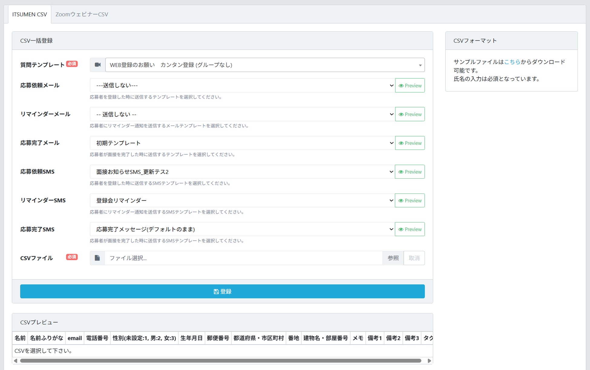 CSV取り込み時にこれまでのメールテンプレートに加え、各種SMSテンプレート(応募依頼・リマインダー・応募完了)を選択できるように仕様変更をおこない、個別登録と同様の仕様となりました。