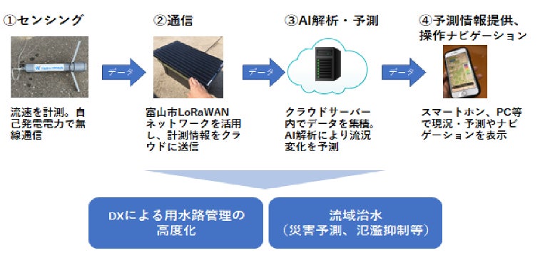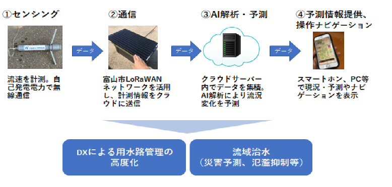 このたびの実証事業は、牛ヶ首用水を実証フィールドとして、HV社が開発する振り子型水力発電モジュール「ハイドロヴィーナス」の設置および増水リスクを予測するソフトウェア技術の実証実験を行うもので、データ解析やAIを活用した水量制御の最適化、DXによる用水管理技術の高度化、流域治水の可能性などを検証していくものです。また、富山市の省電力広域エリア無線通信(LPWA)ネットワークである「富山市センサーネットワーク」を利活用し、センシングモジュールによって取得されるデータを遠隔で取り込み、監視します。季節や降雨状況によって流速や水位がどのように変化するのか、その関連性を検証し、DXによる用水管理や水位上昇の予測につなげていきます。