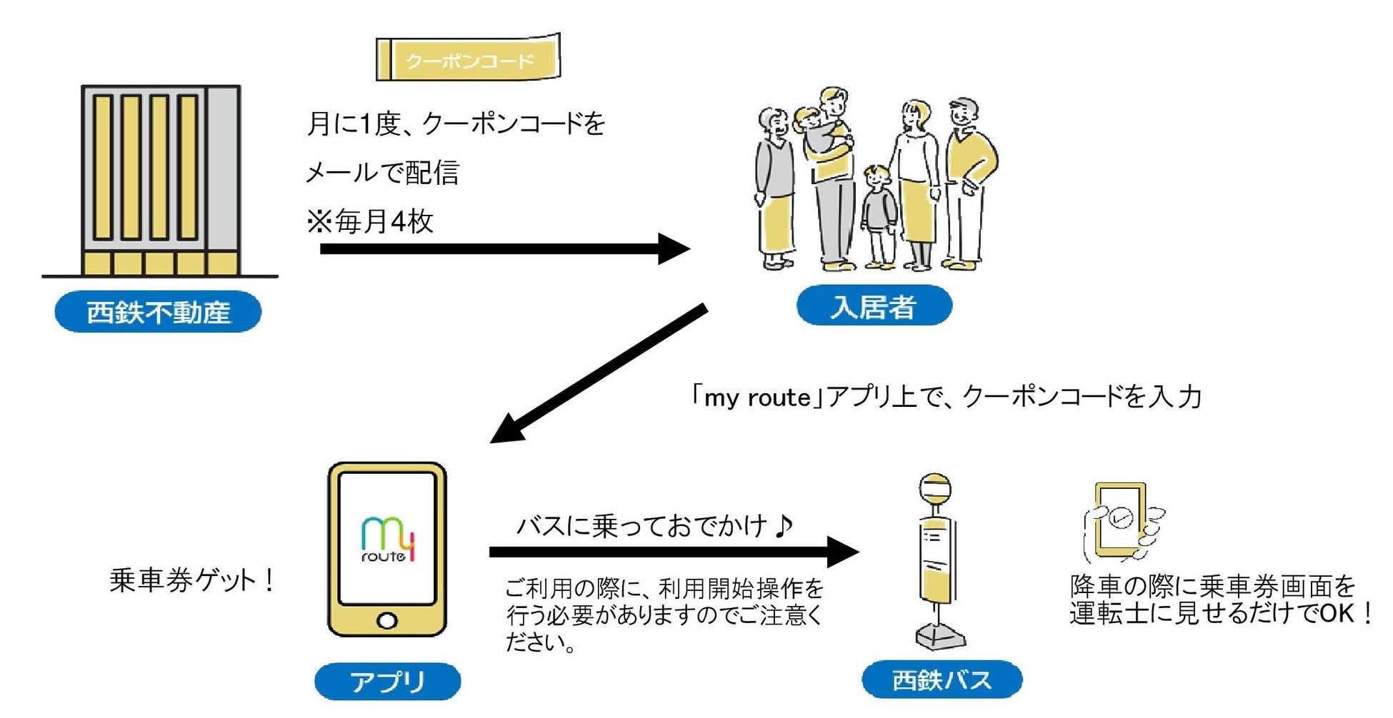 西鉄不動産㈱による仲介で、対象物件の賃貸借契約を締結された新規入居者さまに対し、おでかけアプリ「my route」上で展開する西鉄バスのデジタル乗車券を進呈します。