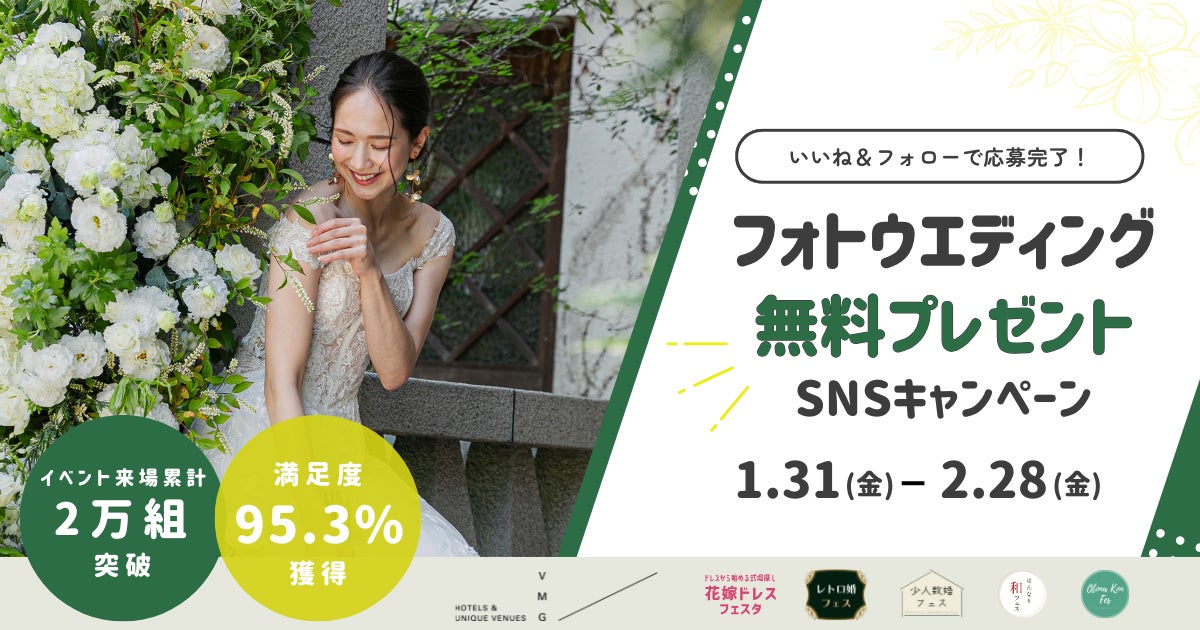 バリューマネジメント株式会社(本社:大阪府大阪市、代表:他力野 淳、以下当社)が企画・運営をするウエディングイベント「VMGウエディングフェス」への来場組数累計が2万組を突破(※1)したことを記念し、フォトウェディングが当たる期間限定のSNSキャンペーンを開催いたします。