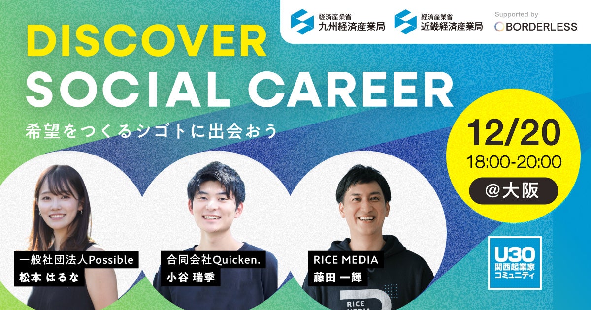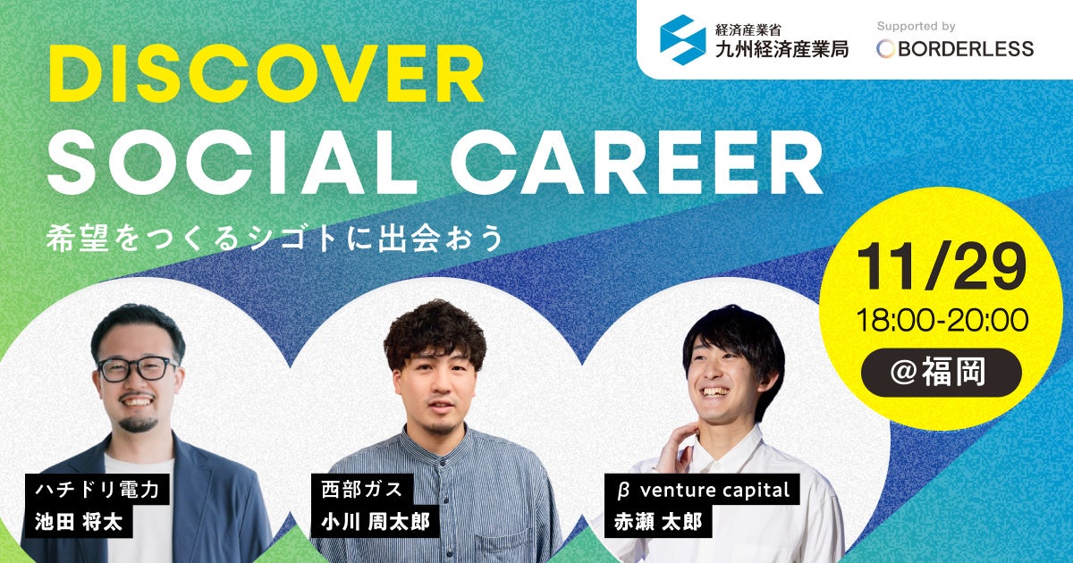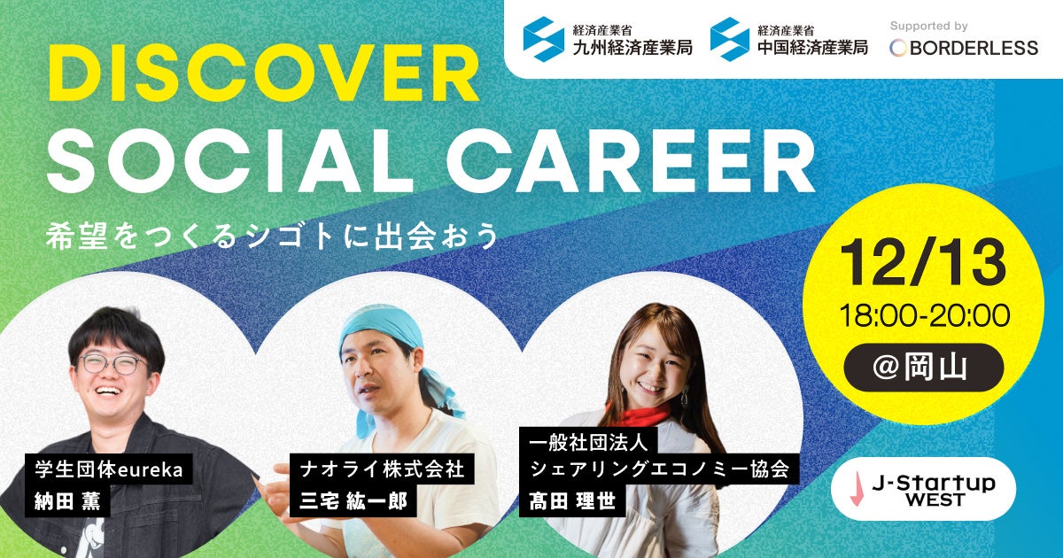 この度、学生・若手人材が多様なソーシャルキャリアに出会えるイベント「DISCOVER SOCIAL CAREER」を福岡・岡山・大阪で開催することが決定いたしました。ビジネスを通じて社会課題を解決することに関心のある方のご参加をお待ちしております。