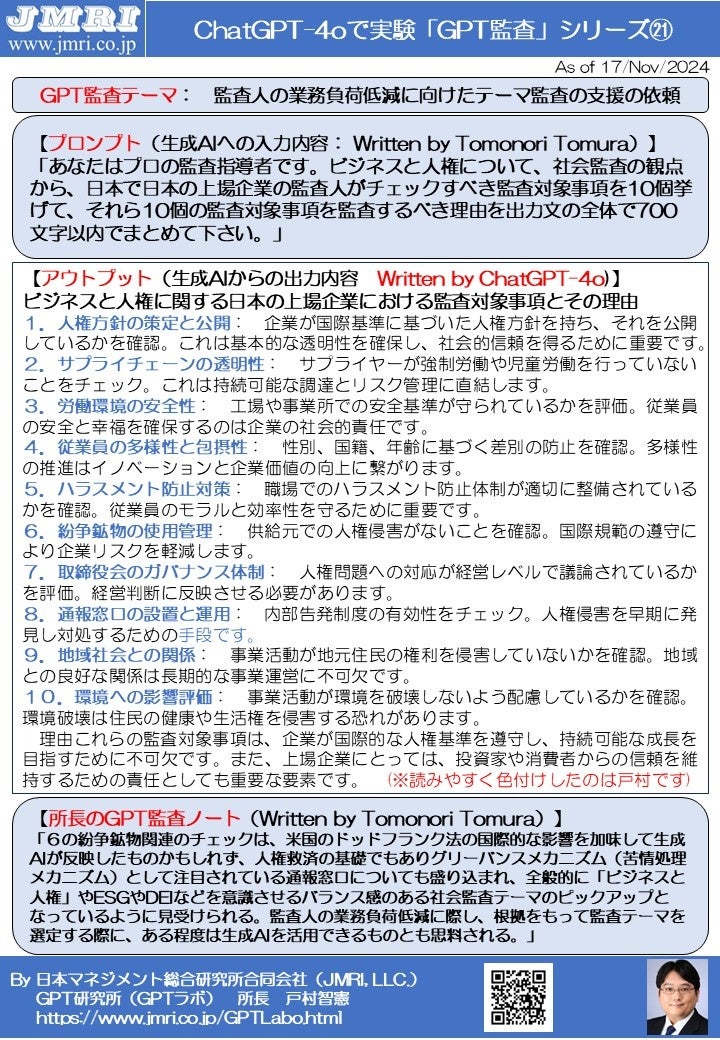 生成AIを監査するGPT監査レポート第21号を公開:テーマ監査の選定に生成AIを利用した際の監査報告by戸村智憲(GPT監査人)【日本マネジメント総合研究所合同会社】