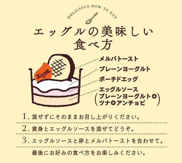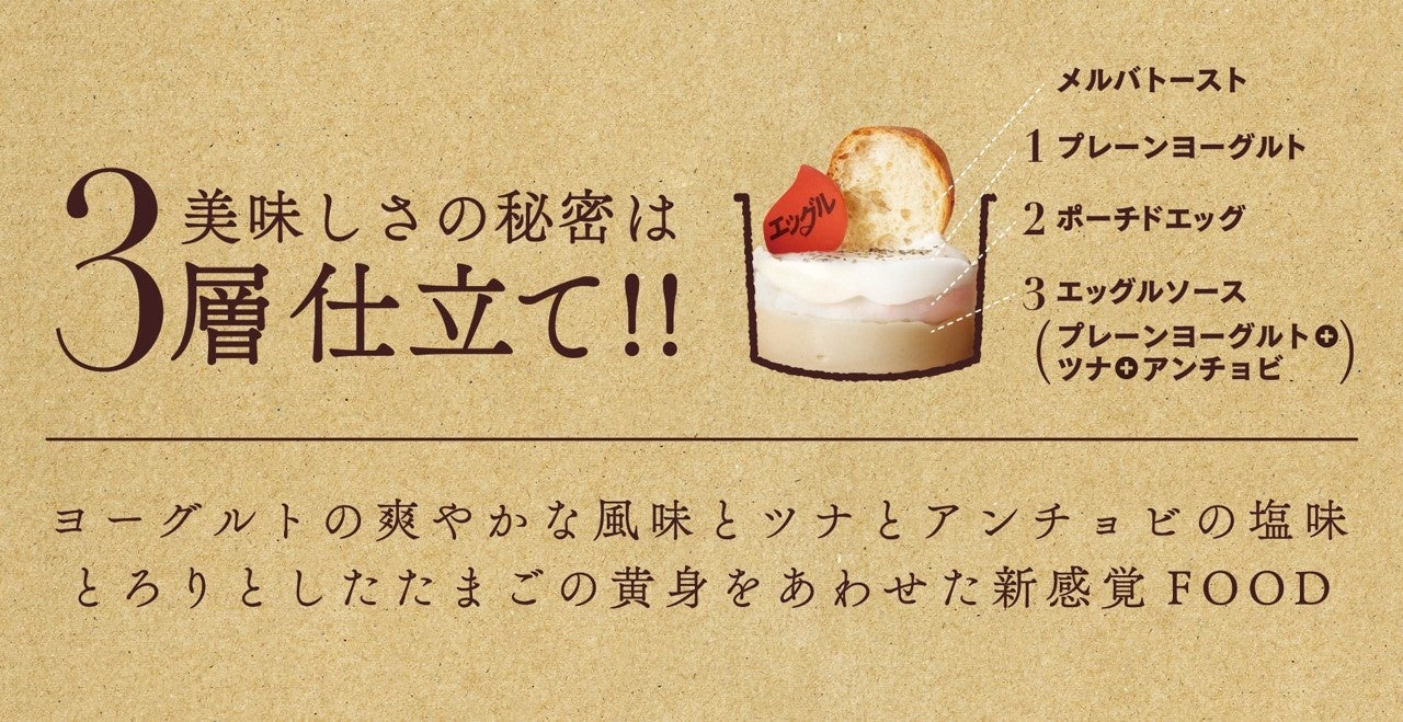 店名にもなっている「エッグル」とは、ヨーグルトとエッグ(卵) を合わせた新メニューの造語。ヨーグルトの新しい食べ方を研究する中で、世界のヨーグルト料理で、ブルガリアやトルコの料理にあったメニューからヒントを得て、ヨーグルトにポーチドエッグを入れて食べる“新感覚の食卓Food「エッグル」”が誕生しました。