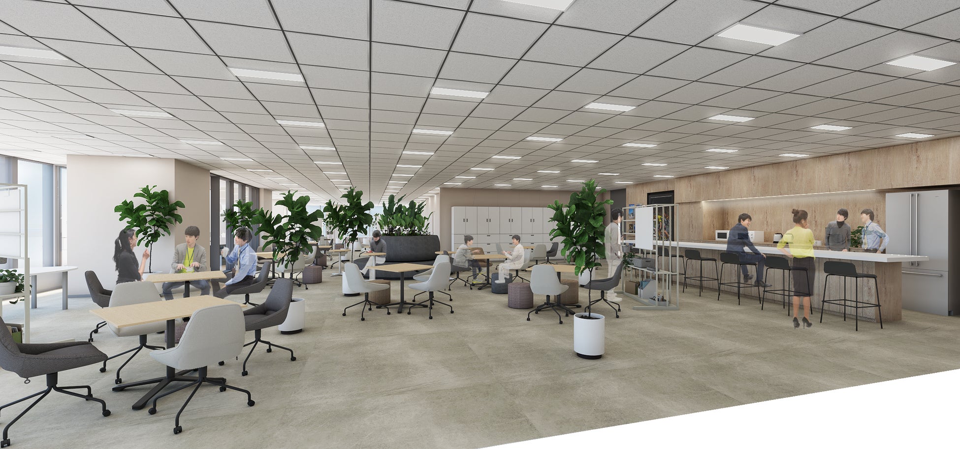 移転先では従来のオフィス環境から、業務内容や目的に応じて自ら席を選択できるオフィス環境に移行し、社員同士のコミュニケーションの活性化をすすめ、グループシナジーによるイノベーションの創出をすすめていきます。また、社員の心身の健康が企業価値創造の源泉であり、持続的な成長基盤になるという認識のもと、心地よい温度と照明などの環境を整備し、植栽を多く取り入れ、オフィス環境什器なども全面的に見直し、健康に最大限配慮したオフィス作りをすることで、働く一人ひとりのモチベーションとパフォーマンス向上を目指します。