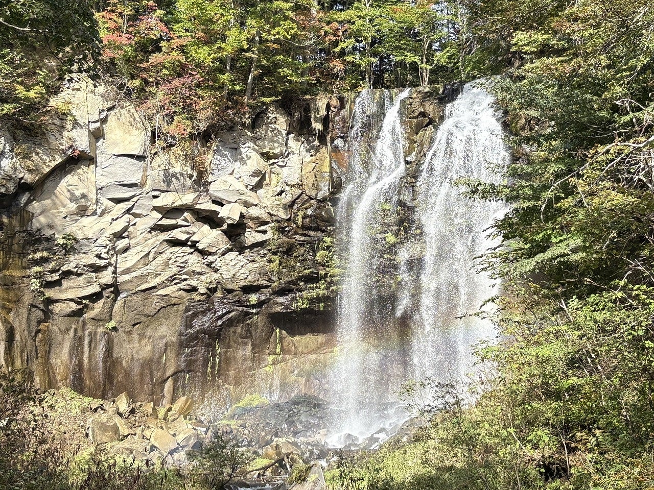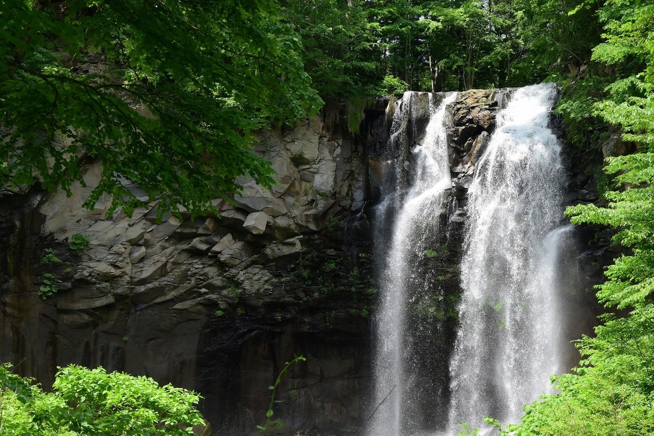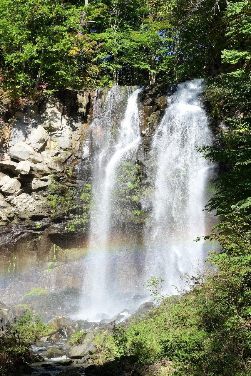 この滝は右側の厚別川本流を落ちる雄滝と左側の清水沢川の落ちる雌滝に分かれており、水量も豊富で、迫力ある姿が楽しめます。