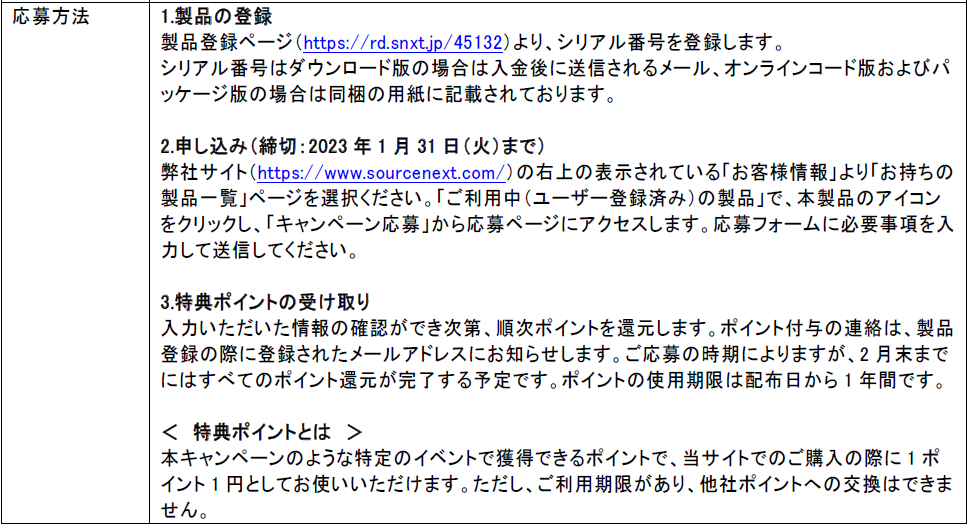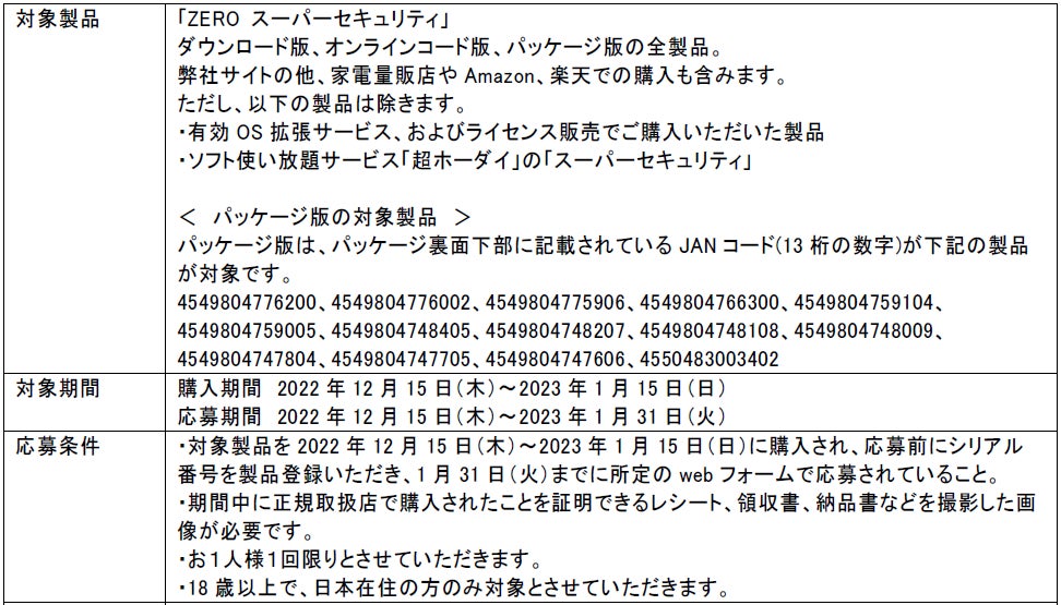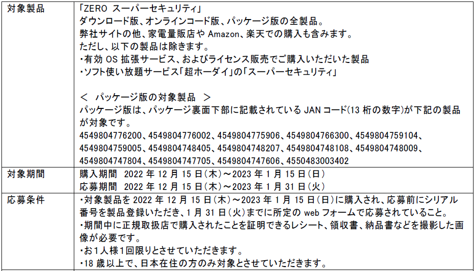 今回のキャンペーンは、新年に向けたパソコンの買い替えをご検討されるお客様を応援するもので、「ZERO スーパーセキュリティ」シリーズ製品の各標準価格の30%を弊社サイトで利用できるポイントで還元します。期間中、正規取扱店で本製品をご購入し、弊社サイトで製品登録後、所定のページからご応募いただいたお客様全員が対象です。