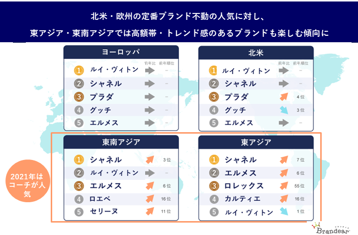 - アジア圏ではシャネルが人気、欧米圏ではルイ・ヴィトンが人気