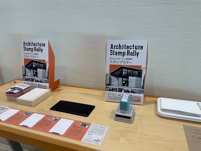また本展会期に併せ、「松江のモダニズム建築群スタンプラリー」も実施しています。松江市内の7か所の建築を巡りスタンプを集めると、記念缶バッジを1個プレゼントしています!