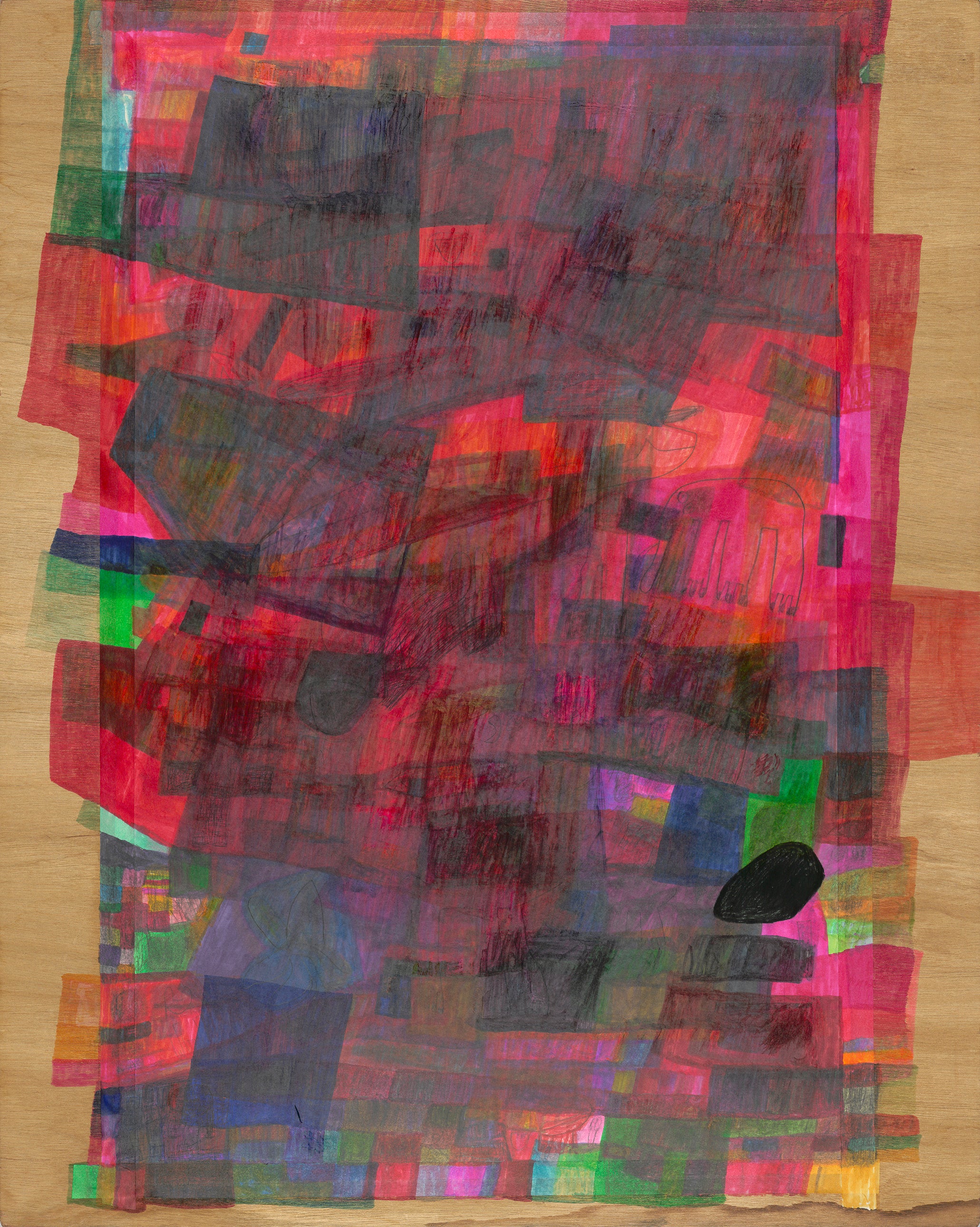彼女の制作は、おいしいものやおしゃべりを楽しむ日常の延長にある。休日に行きたい場所や食べたいものについてスタッフと話すことから制作モチーフが生まれ、彼女はゆっくりと筆を進めていく。制作ペースは独特で、複数の作品を同時に進めながら、時には何年も未完成のまま置かれることもある。本作品の制作期間は6年。支持体にシワやシミができることすら、作品の一部となっていく。描画にはボールペンや鉛筆を用い、コピックなどで丁寧に色を塗り重ねる。色選びは直感的で、一見するとモチーフに関係のないと思われる色を選ぶことも多いが、そうして少しずつ塗り込まれた画面には色と時間の層が生まれ、不思議な深度を生み出していく。