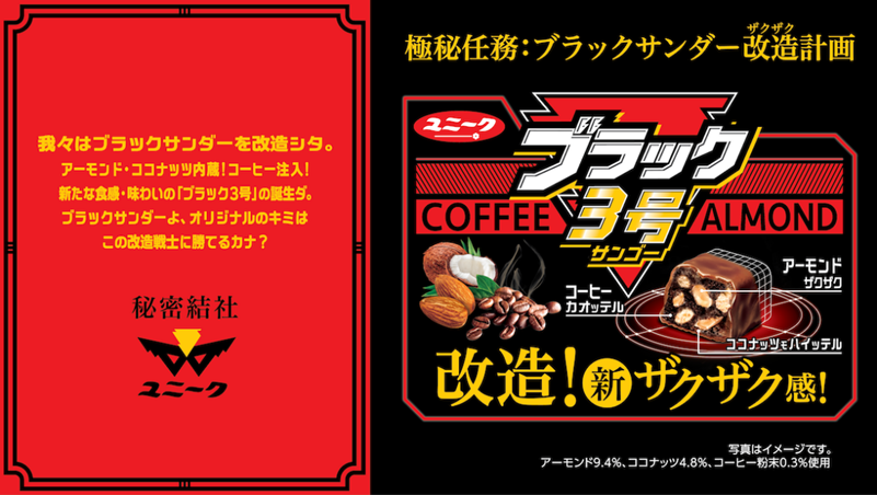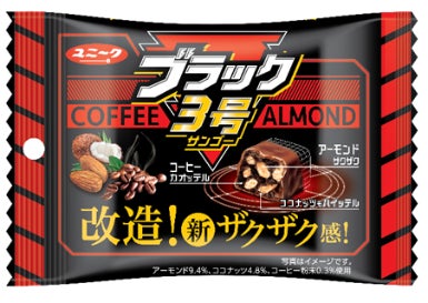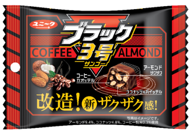 このたび、発売から1年を経て、ブラックサンダーをさらに改造した、新たな公式ライバル「ブラック3号」を発売いたします。ブラックサンダーらしさの一つである「ザクザク感」のココアビスケットに加え、2種類のアーモンドを配合することで、新たな「ザクザク感」に仕上げました。さらにコーヒーやココナッツでアクセントを加えることで、チョコレートとナッツに調和され新たなおいしさを引き出しています。