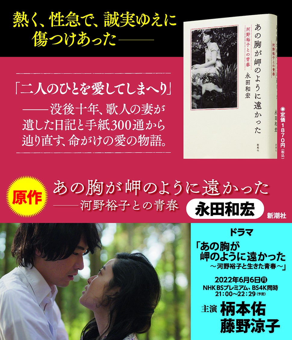 本書を原作とするNHKドラマの放送日も決定しました。柄本佑さん、藤野涼子さん主演の「あの胸が岬のように遠かった ~河野裕子と生きた青春~」はBS プレミアム(BS4K 同時)で2022 年6月6(月)よる9時~10時29分放送です。