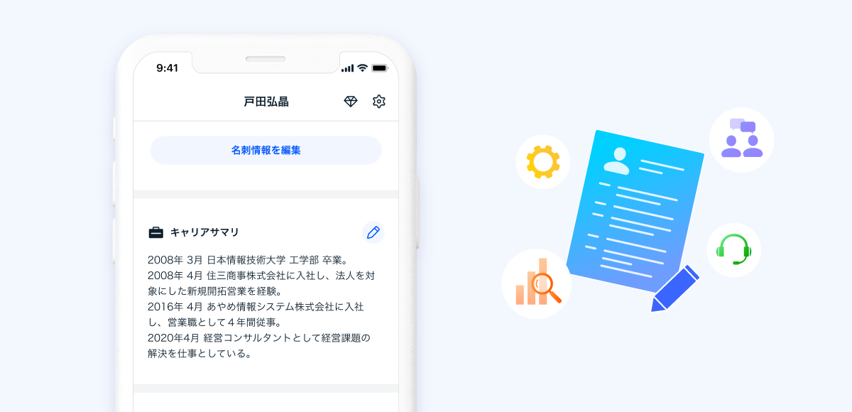 Eightでは、名刺情報以外にもキャリアサマリや職歴、学歴やスキルタグなどの情報が入力できます。そのため、名刺交換した相手と思わぬ共通点が見つかりやすく、紙の名刺よりもコミュニケーションのきっかけをつくりやすいという特徴があります。