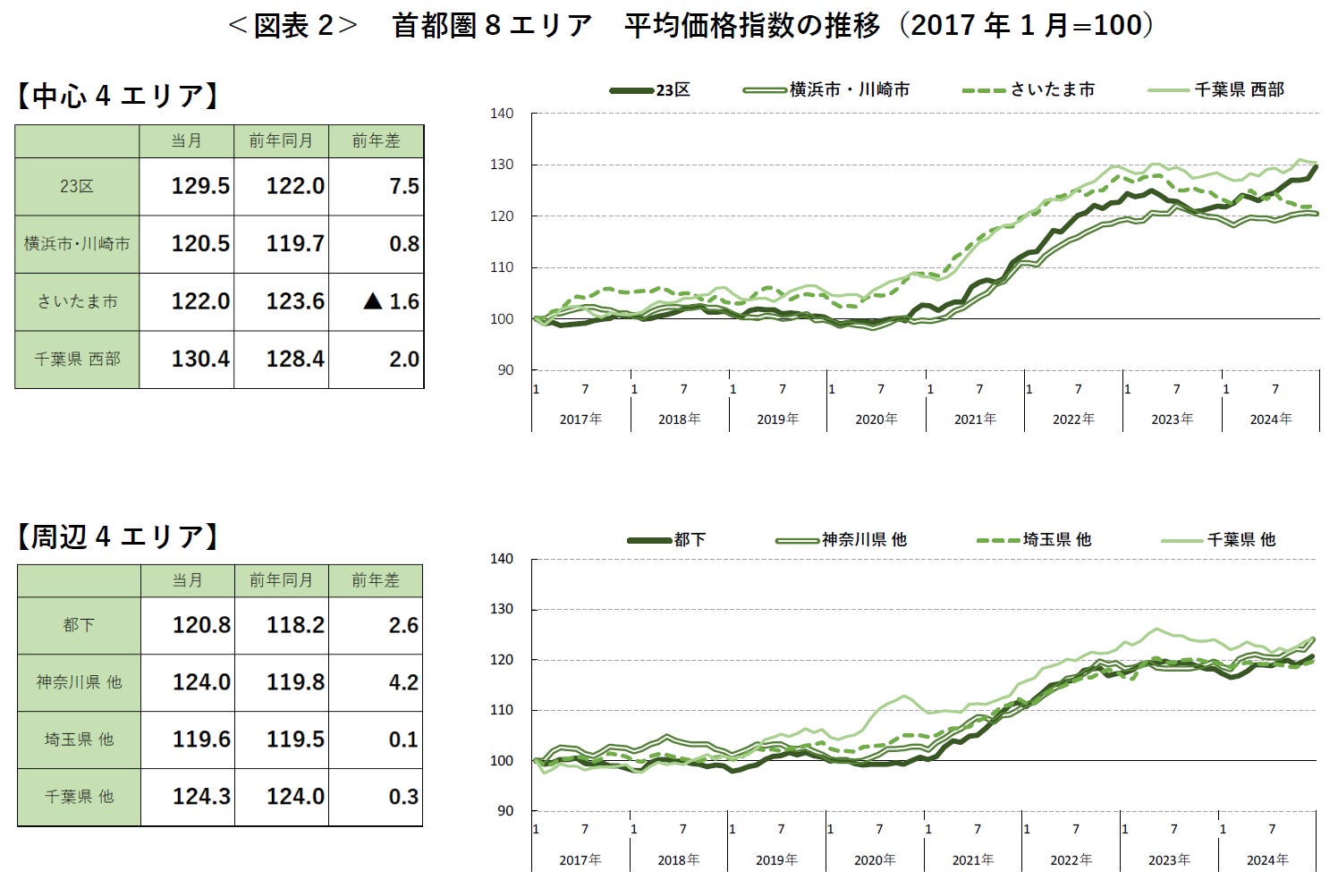 首都圏全体の平均価格は前月比+0.7%と5カ月連続で上昇した。また、前年同月比は+1.6%と4カ月連続で前年同月を上回った。