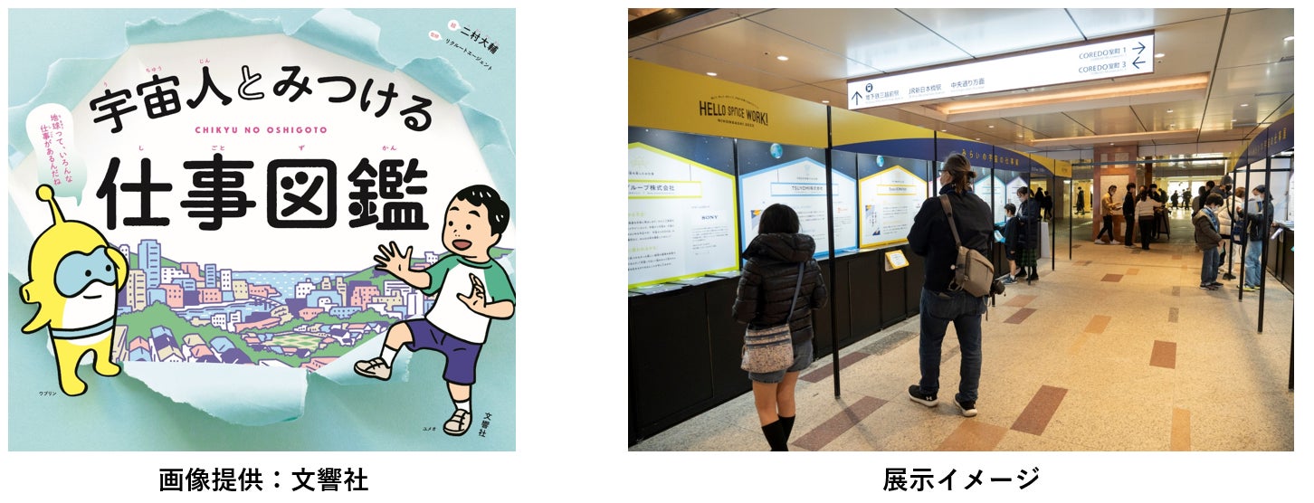 2022年に発売され話題になった子ども向けのお仕事紹介図鑑『宇宙人とみつける仕事図鑑』とのコラボ企画を実施。書籍の登場人物である宇宙人の“ワプリン”と将来の夢が分からない“ユメオ”と一緒に、人工衛星製造や宇宙食製造など、宇宙産業の拡大で需要が増える宇宙の仕事や日本橋に集まる宇宙ベンチャー企業での仕事を探っていくパネル展示を実施します。宇宙が身近な存在であることを感じてもらい、将来自分も宇宙ビジネス企業で働いてみたいと思えるような仕掛けで宇宙の仕事を紹介します。