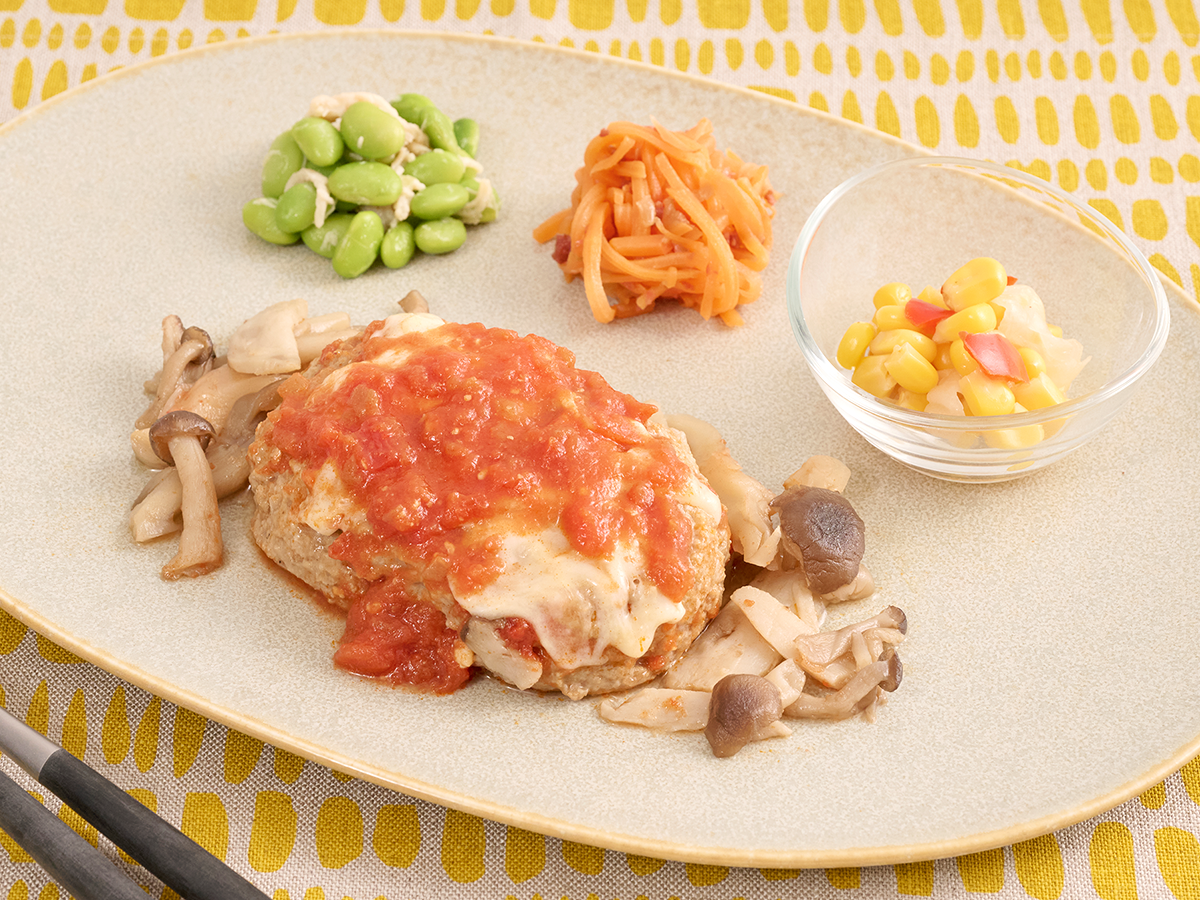 世代を問わず愛され続けるトマトソースのハンバーグがリニューアルして登場!やわらかいジューシーなハンバーグに3種類のきのことチーズをトッピングし、まろやかな酸味のトマトソースで仕上げました。たっぷりのきのこの香りが食欲をそそり、チーズのコク深さと真っ赤に熟したトマトソースの酸味がハンバーグの旨みを引き立てます! 副菜は、枝豆と鶏肉の洋風あえ、人参のガーリックバター、コーンとパプリカが入ったコールスローサラダです。