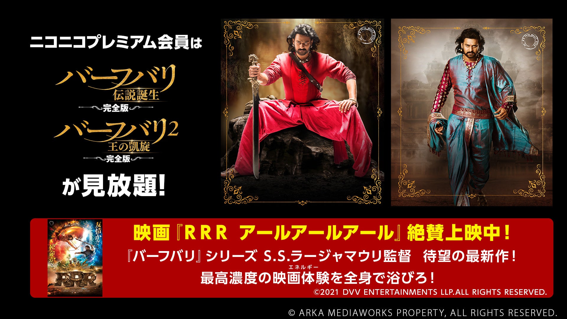株式会社ドワンゴ(本社:東京都中央区)が運営する動画投稿・配信サービス「ニコニコ」では、2022年12月14日(水)より、大ヒット全国上映中の映画『RRR』の応援として、S.S.ラージャウマリ監督のヒット作「バーフバリ 伝説誕生<完全版>」「 バーフバリ2 王の凱旋<完全版>」2作品を月額見放題で期間限定配信、年末年始はインド映画の熱い波に乗り込もう!