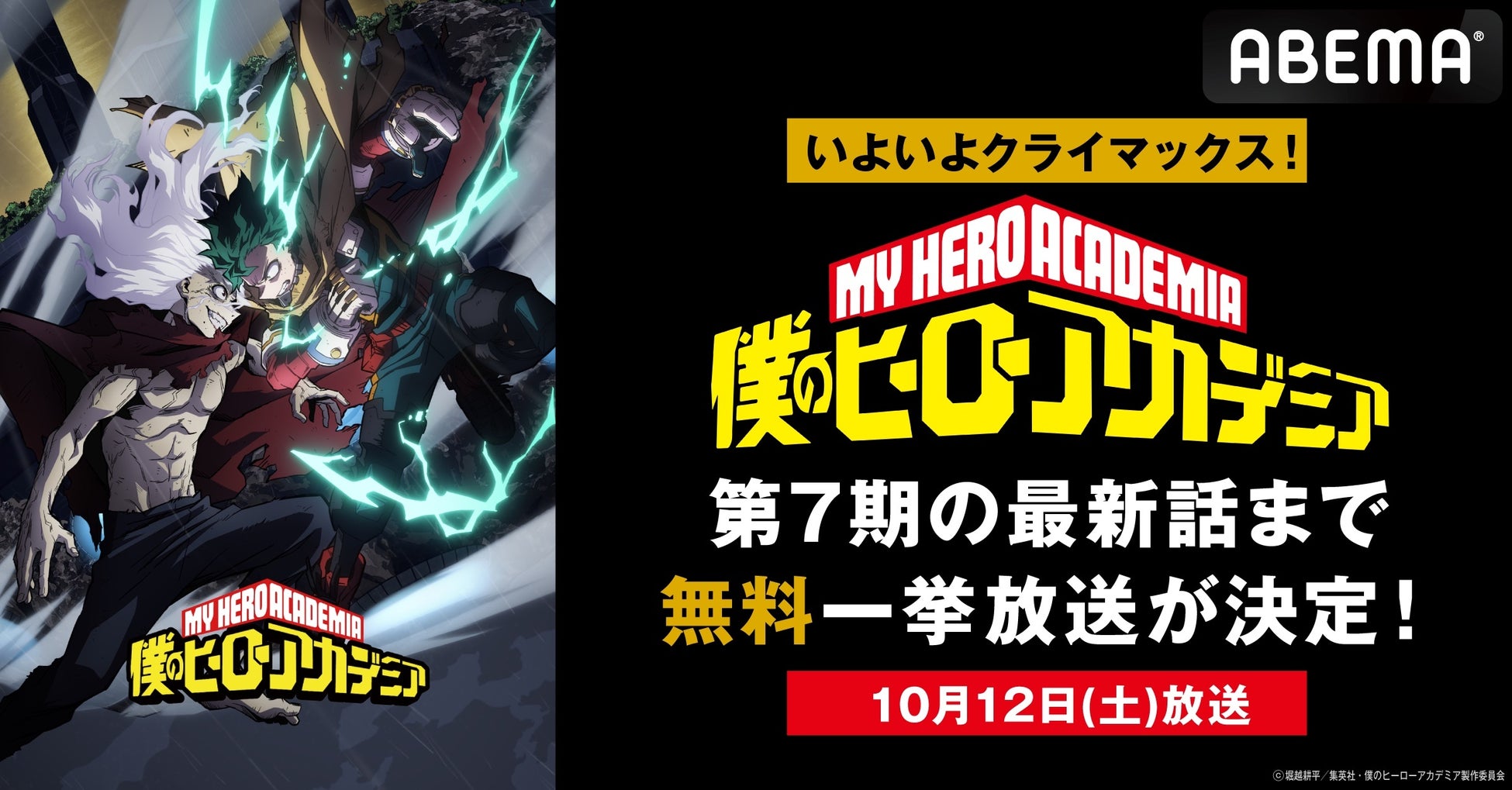 新しい未来のテレビ「ABEMA」は、『僕のヒーローアカデミア』第7期最新話までを、最新話放送当日2024年10月12日(土)に、全話無料一挙放送いたします。