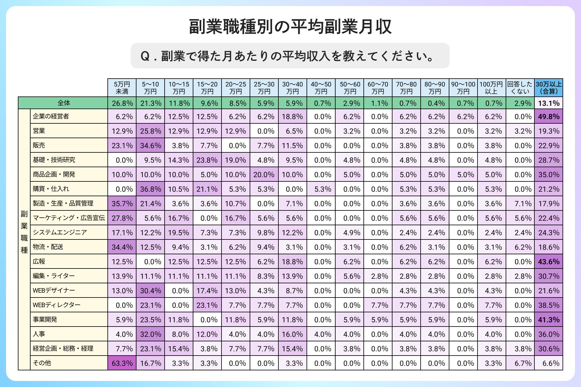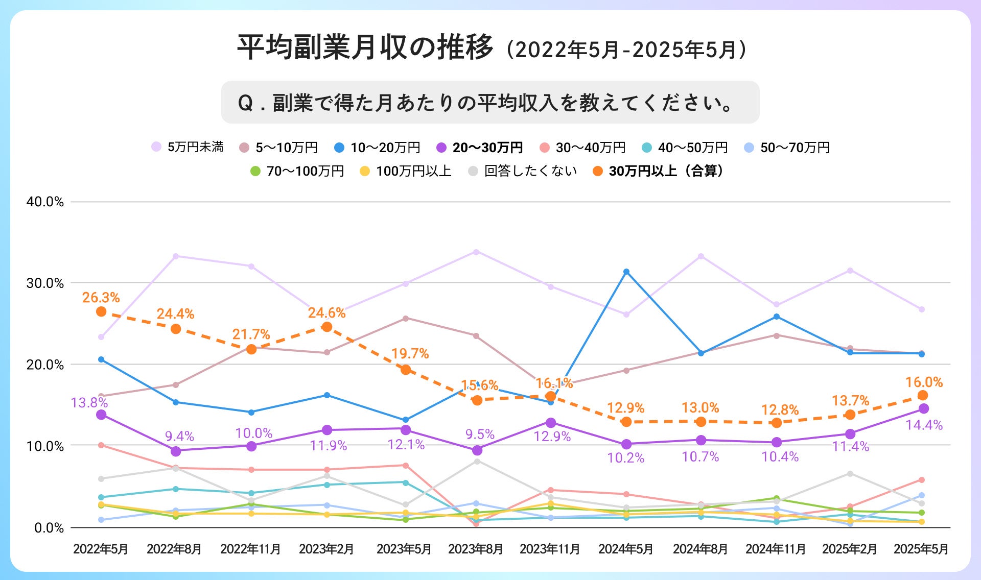・平均副業月収「20万円以上30万円未満」の割合が過去最多に