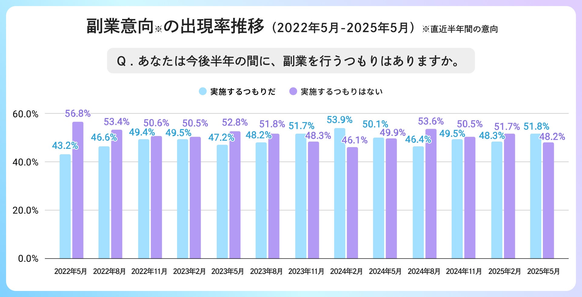 副業経験者の推移を見ると、直近半年間で副業を「実施した」の回答者率は前回調査(2025年2月)の38.6%から42.2%へ3.6ポイント増加し、今後の副業意向も「実施するつもりだ」の回答者率が前回調査の48.3%から51.8%へ3.5ポイント増加していました。また、調査を開始した3年前(2022年5月)の調査結果と比較してみると、副業経験者は8.1ポイント、副業意向は8.6ポイント増加しており、副業というはたらき方の選択肢が、徐々に広がっていることが分かります。