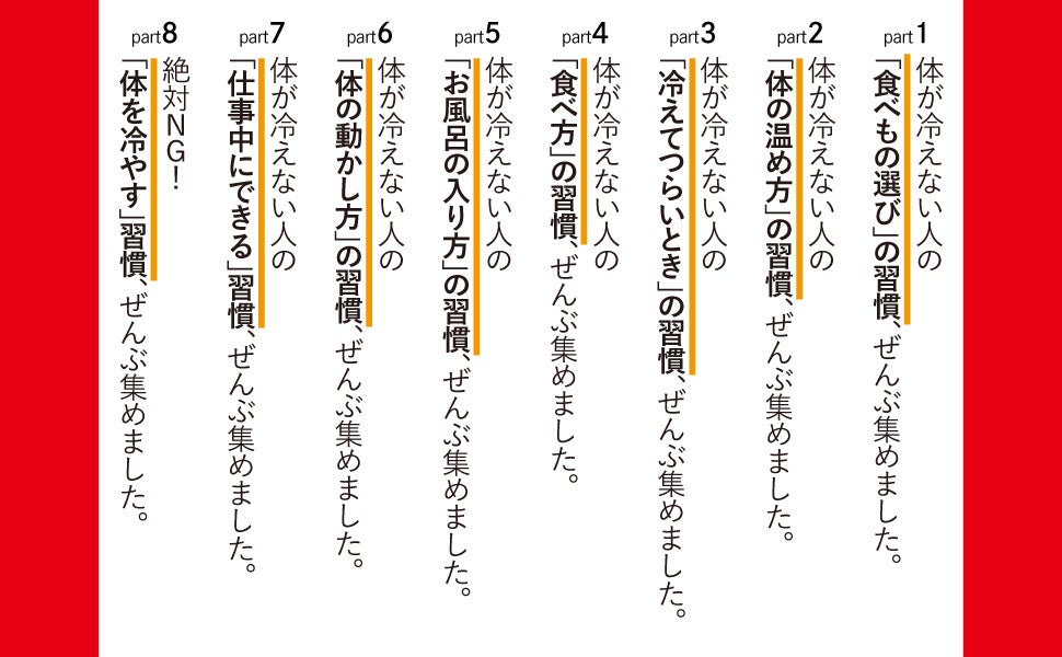 本書は、防寒グッズなどの一時的な温めではなく、食事、入浴、筋肉の使い方、姿勢、呼吸など、さまざまな視点から、冷えない体質に変われる習慣を紹介します。