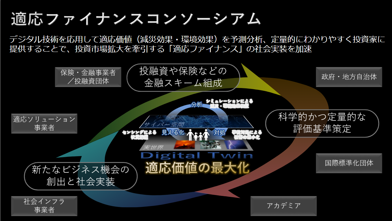 本コンソーシアムでは、デジタル技術を応用して適応価値(減災効果・環境効果)を予測分析し、定量的にわかりやすく投資家に提供することで、仕組みを構築し、様々な適応策、価値評価手法に基づく保険や債券、融資スキーム等の金融商品組成を会員の皆さまやグローバルパートナーと推進していきます。