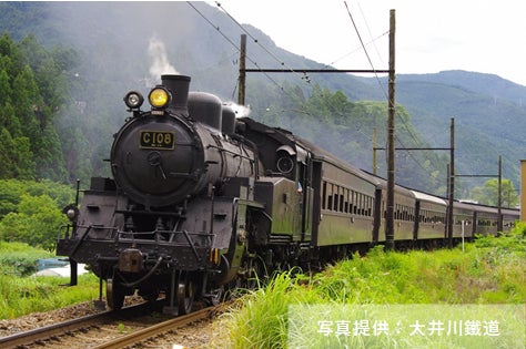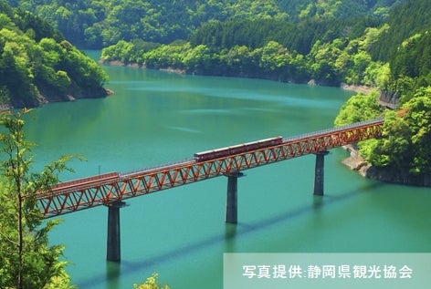 ダム建設のために作られた大井川鐵道井川線の駅。一面が緑色に染まる大自然の絶景と、駅がまるで接岨湖に浮かんでいるかのような不思議な光景に出会うことができる。