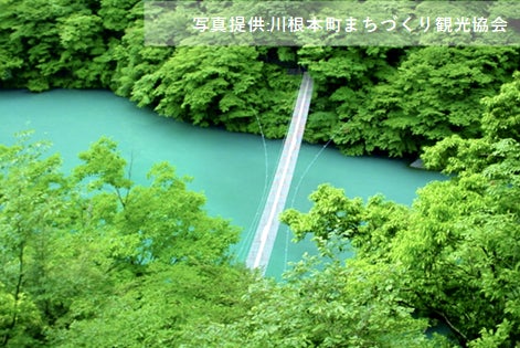 かつては周辺集落を行き来する人々の生活道だった吊橋。幻想的なエメラルドグリーンの湖とまぶしい新緑を感じることのできる、春ならではの絶景スポット。