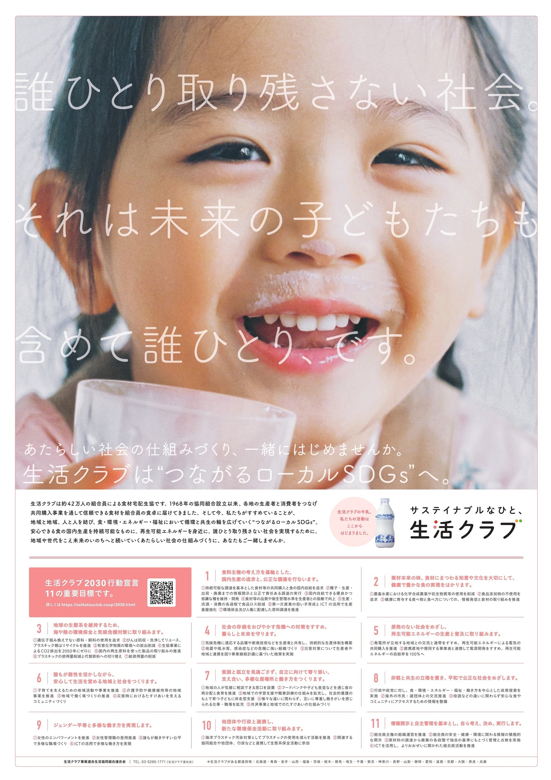 生活クラブ事業連合生活協同組合連合会(本部:東京都新宿区、会長 村上彰一、以下生活クラブ)は、2022年6月27日(月)に、「誰ひとり取り残さない社会。それは未来の子どもたちも含めて誰ひとり、です。」というメッセージを日本経済新聞朝刊(全国版)に掲載しました。