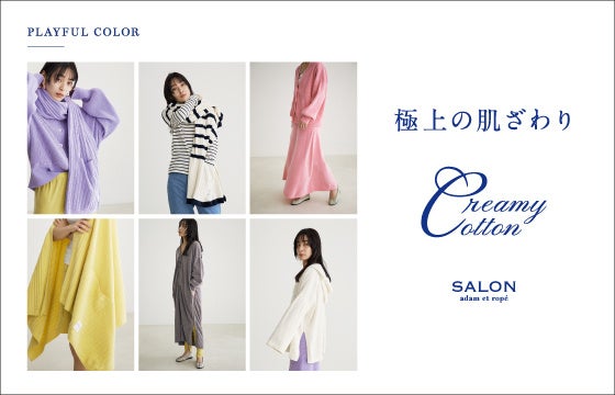 Creamy Cottonは、"わたし時間"を自分らしく彩るリラックスウエアで、「おはようからおやすみまで心地よい毎日」をコンセプトにSALON adam et ropéより生まれたシリーズです。クリーミータッチな、いつまでも触っていたくなる"極上の肌ざわり"と、お出かけにもおうち時間にも着やすいリラクシー&ファッショナブルなデザインで、昨年9月の発売以降多くのお客さまにご愛用いただいております。