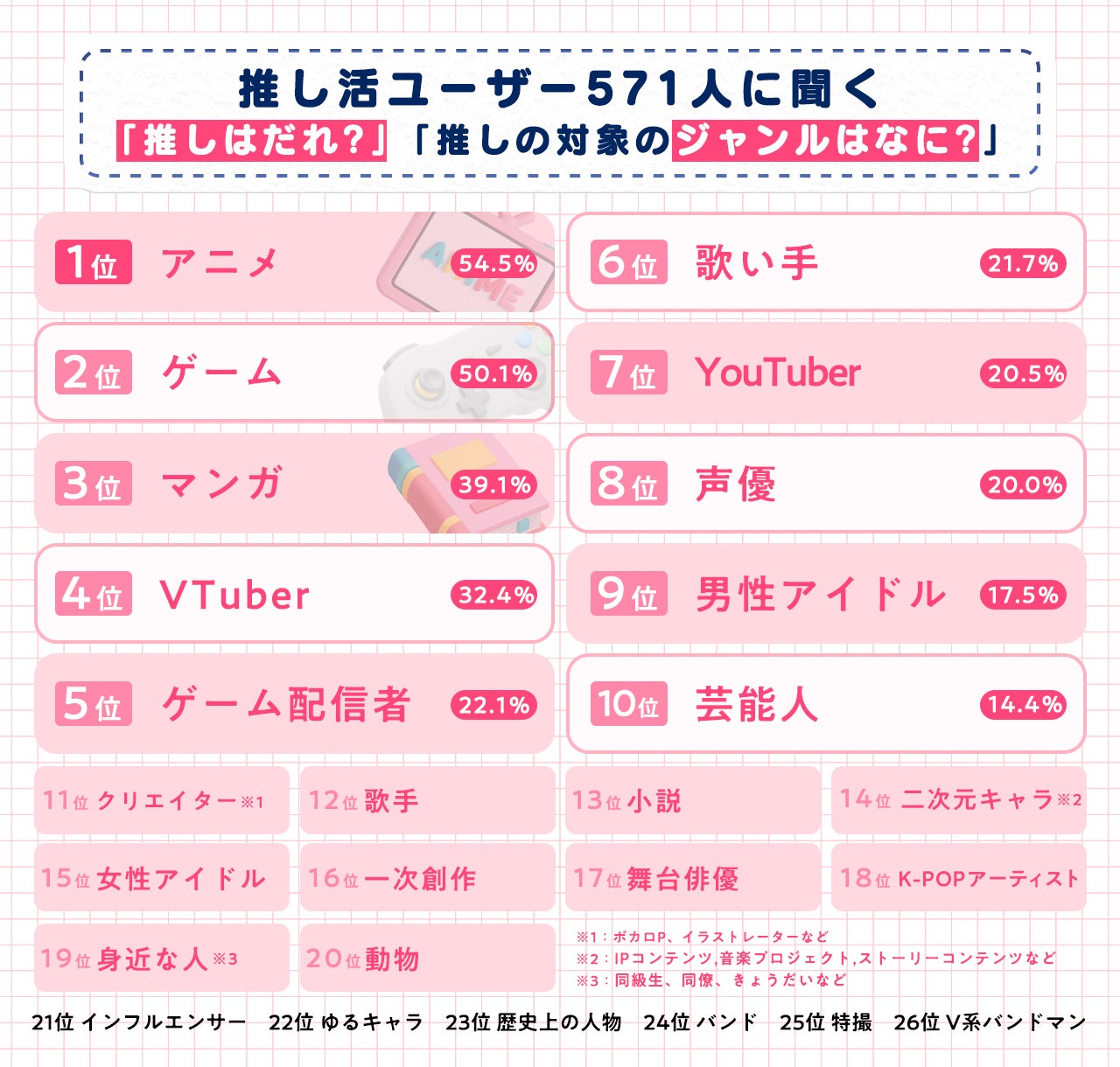 また、声優(20.0%)やYouTuber(20.5%)、芸能人(14.4%)といった実在の人物を対象とした推しも多く支持されていました。