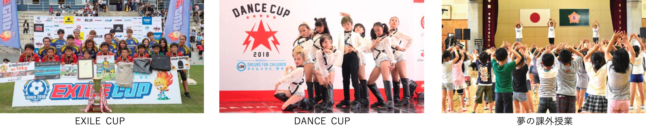 一方LDH JAPANは、“エンタテインメントだからこそできる社会貢献がある”という想いのもと、「Dreams For Children・子どもたちに、夢を。」をテーマに、日本、そして世界の未来を担う子どもたちに夢を持つことの素晴らしさを伝え、フットサル大会「EXILE CUP」、ストリートダンスコンテスト「DANCE CUP」、各界で活躍する人物を小・中学校に招き、共同で何かを創り上げるプロジェクト「夢の課外授業」をはじめ、その夢を応援する様々なプロジェクトを展開。所属アーティスト、タレント、スタッフ、LDH JAPAN全体で様々な社会貢献活動に取り組まれています。