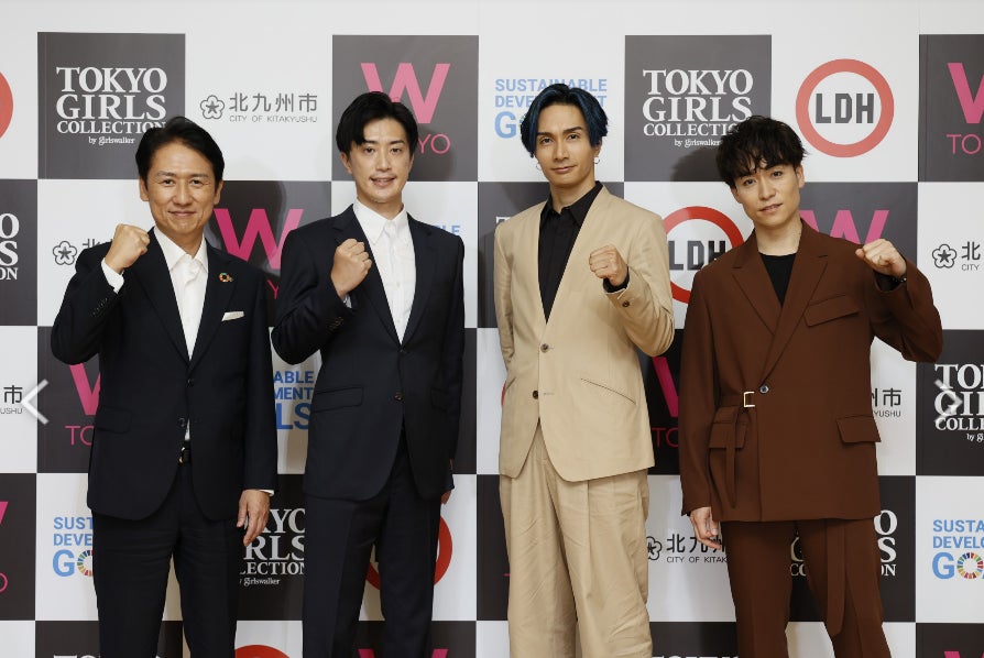 <写真左から> 武内和久氏(北九州市長)、辻本優一(東京ガールズコレクション実行委員会、株式会社W TOKYO 地⽅創⽣管掌役員)EXILE 橘ケンチ氏、EXILE TETSUYA氏