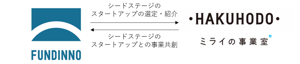FUNDINNOはスタートアップに関する情報量と評価力を強みとしています。FUNDINNOとの業務提携を通じて、博報堂はFUNDINNOから将来性のあるシードステージのスタートアップの選定と紹介を受け、自社で推進する事業との連携や、博報堂が有する企業・メディアネットワークとのマッチング支援などを行い、シード期にあるスタートアップと事業共創を行っていきます。