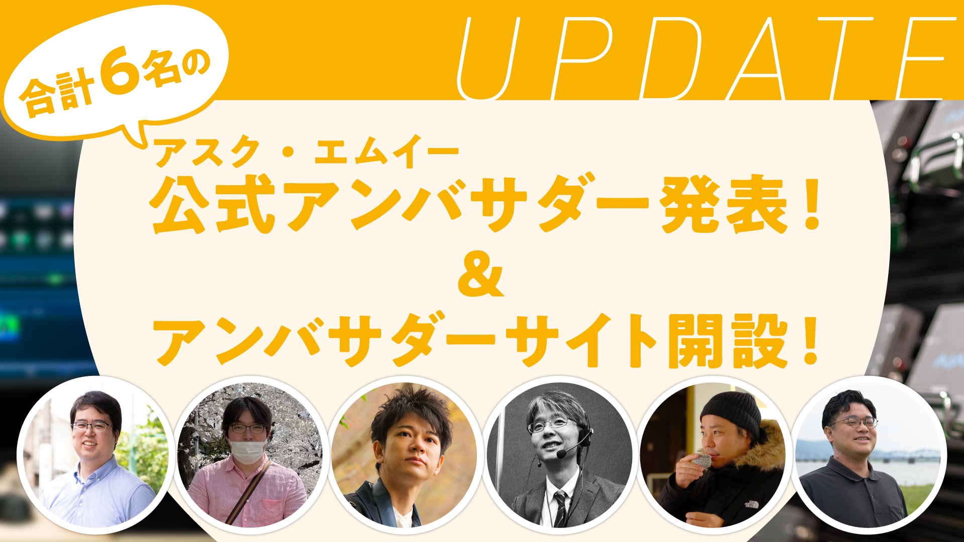 アスク・エムイーは同社の取り扱いソリューションあるいは製品・サービスを使用されている方で、将来に渡っても熱心なファンとなり、高い知見を持って情報発信をしてくださる方を『アンバサダー』として認定し、アスク・エムイーの一員として活動いただく取り組みを行っています。この度、多数のご応募をいただいた中から厳正なる選考を行い、6名の方に 2023 年度アンバサダーとしてご参加いただくことが決まりました。