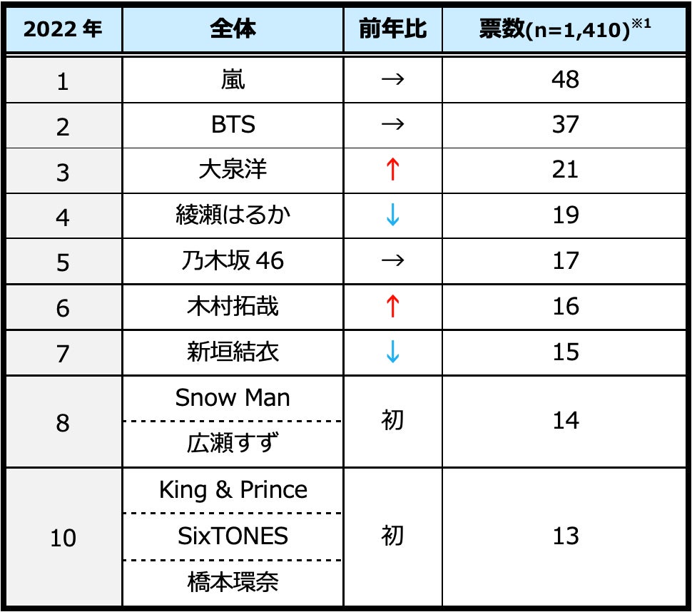一方、女性のトップ2は総合順位と同じく「嵐」が1位、「BTS」が2位となりました。女性はトップ10のうち7組がジャニーズ事務所に所属するメンバーおよびグループがランクインする結果となりました。
