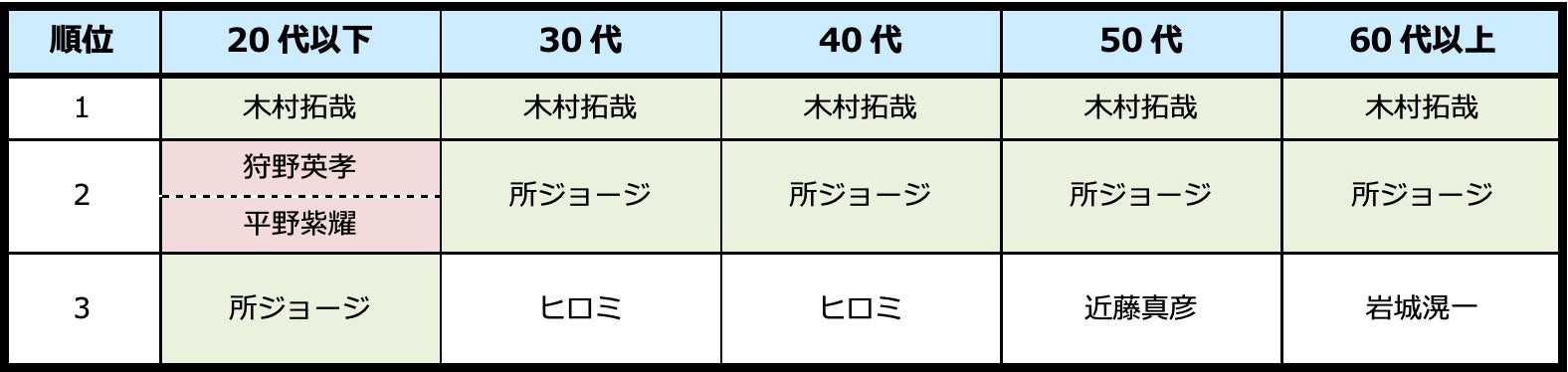 年代別で見ると、30代〜60代以上のトップ2は全て同じですが、20代以下の回答では、他の年代では2位の「所ジョージ」が3位となり、2位が「狩野英孝・平野紫耀」という結果になっています。