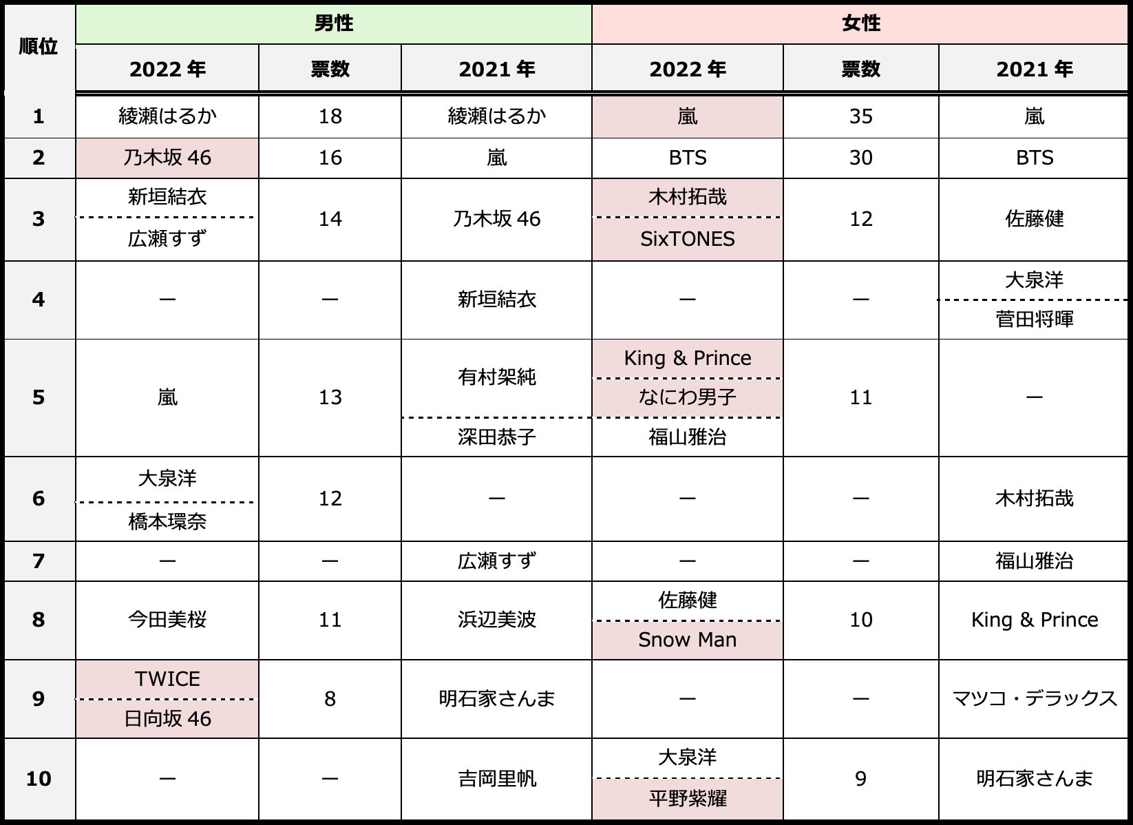 | ② 2年連続で男性は「綾瀬はるか」が1位、女性は「嵐」、「BTS」がトップ2に! |