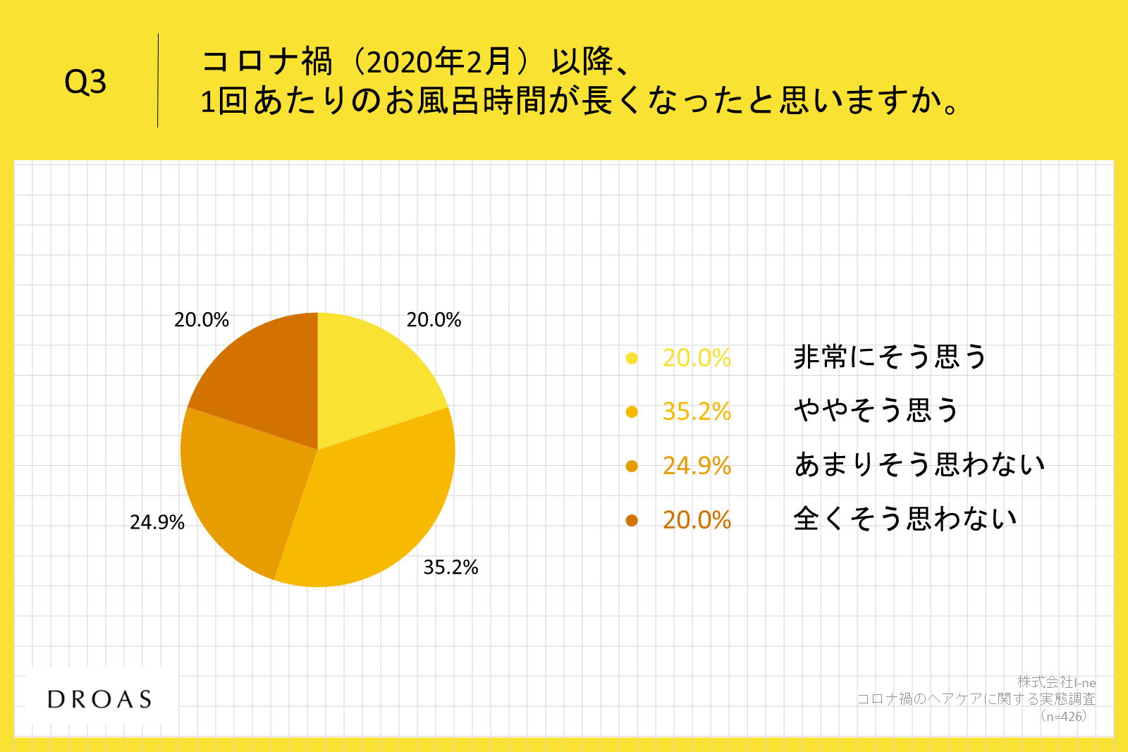 「Q3.コロナ禍(2020年2月)以降、1回あたりのお風呂時間が長くなったと思いますか。」(n=426)と質問したところ、「非常にそう思う」が20.0%、「ややそう思う」が35.2%という回答となりました。