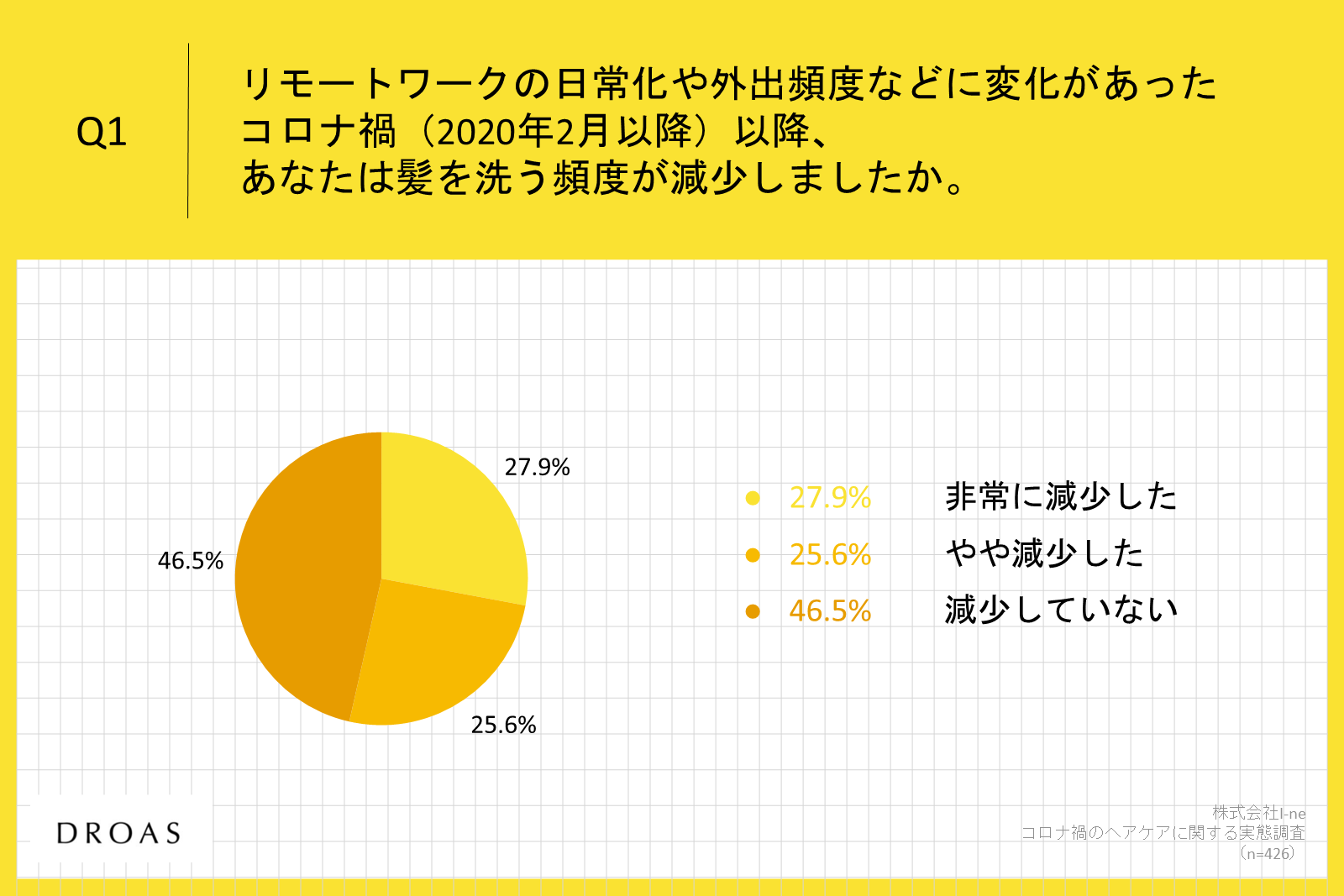 「Q1.リモートワークの日常化や外出頻度などに変化があったコロナ禍(2020年2月以降)以降、あなたは髪を洗う頻度が減少しましたか。」(n=426)と質問したところ、「非常に減少した」が27.9%、「やや減少した」が25.6%という回答となりました。