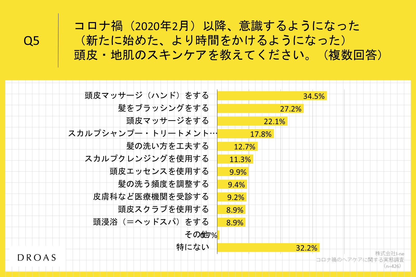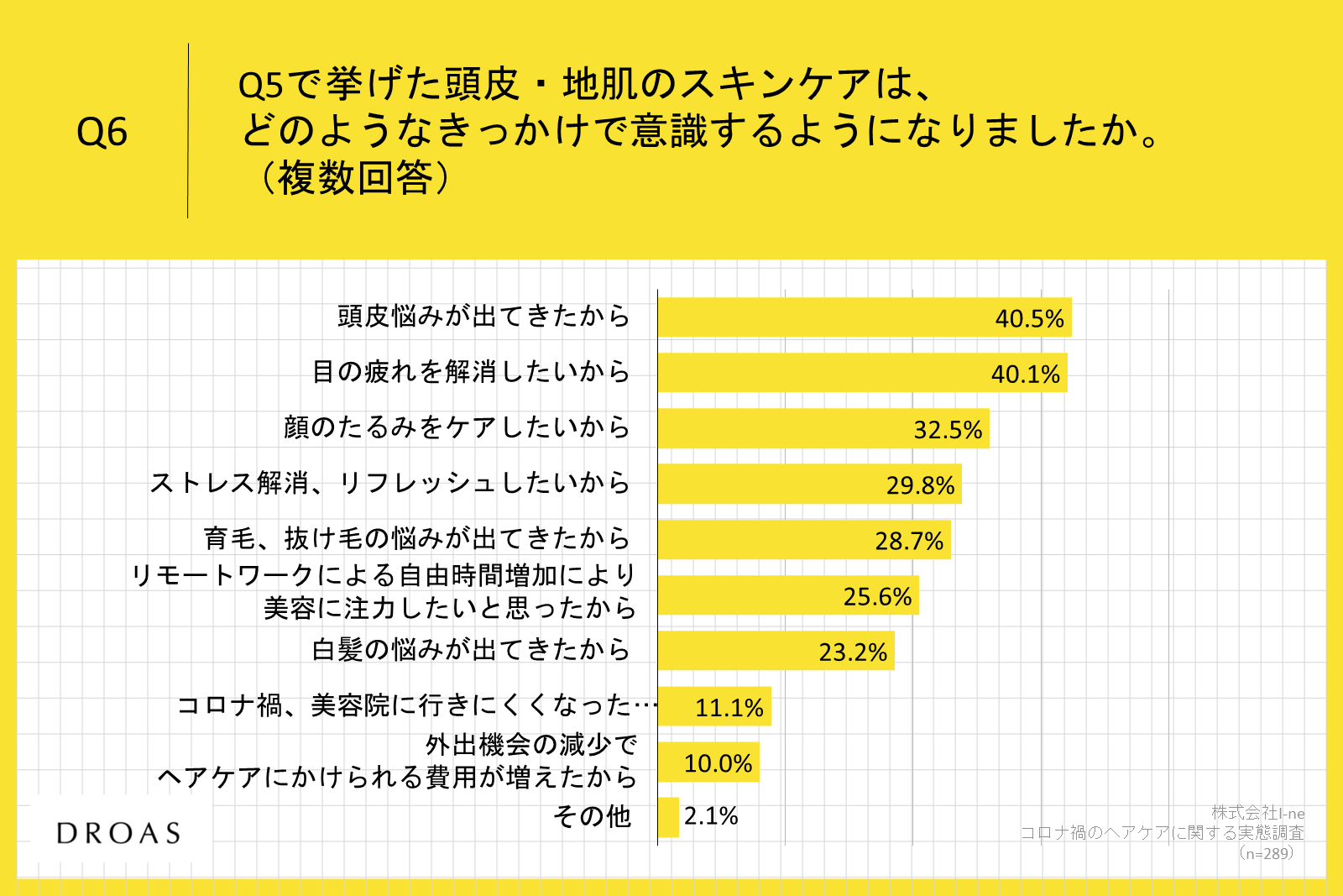 「Q.5コロナ禍(2020年2月)以降、意識するようになった(新たに始めた、より時間をかけるようになった)頭皮・地肌のスキンケアを教えてください。(複数回答)」(n=426)と質問したところ、「頭皮マッサージ(ハンド)をする」が34.5%、「髪をブラッシングをする」が27.2%、「頭皮マッサージ(スカルプブラシ、電動マッサージ器などを用いて)をする」が22.1%という回答となりました。また、「 Q5で挙げた頭皮・地肌のスキンケアは、どのようなきっかけで意識するようになりましたか。(複数回答)」(n=289)と質問したところ、「頭皮悩みが出てきたから」が40.5%、「目の疲れを解消したいから」が40.1%、「顔のたるみをケアしたいから」が32.5%という回答となりました。