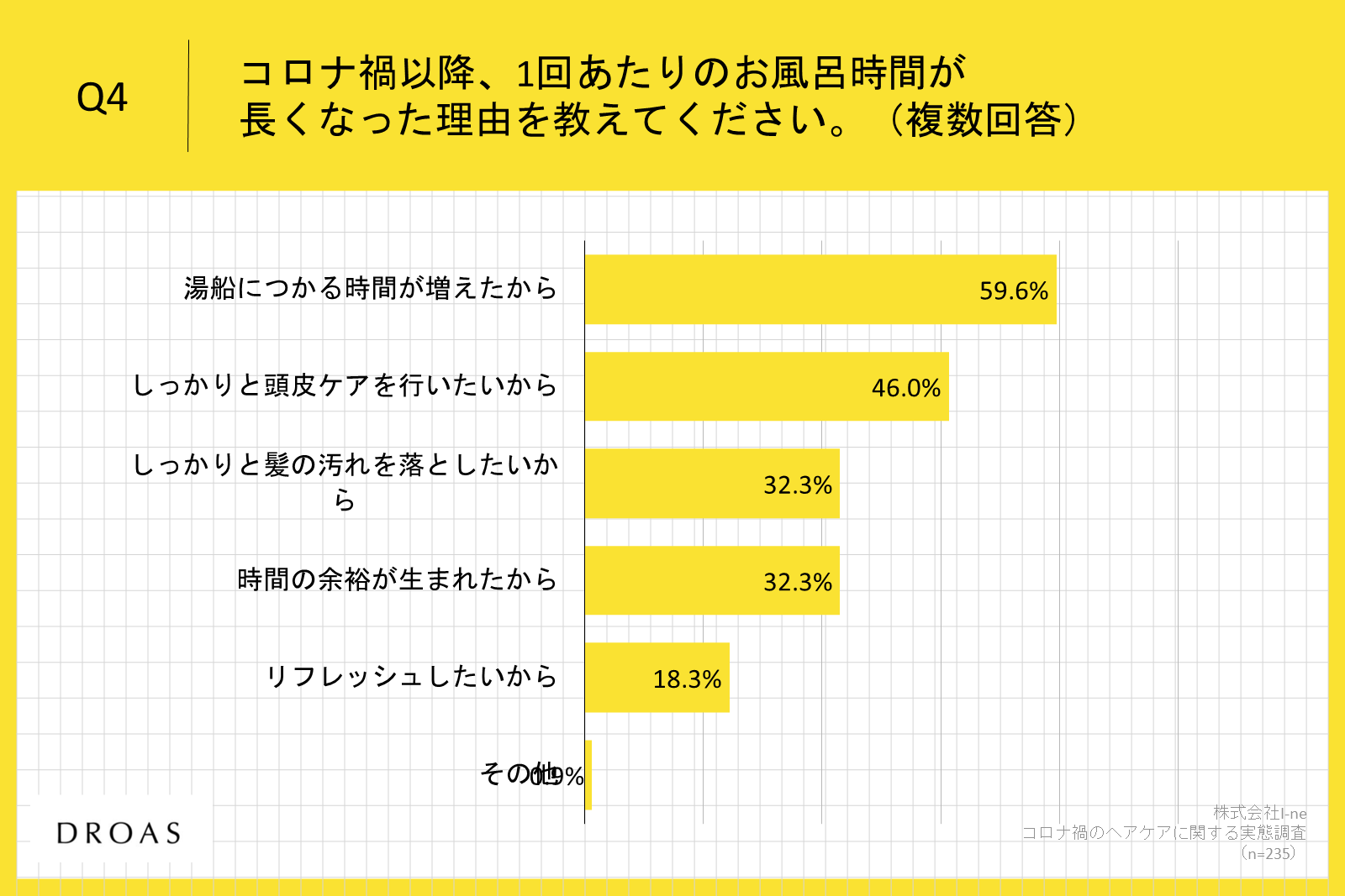 Q3で「非常にそう思う」「ややそう思う」と回答した方に、「Q4.コロナ禍以降、1回あたりのお風呂時間が長くなった理由を教えてください。(複数回答)」(n=235)と質問したところ、「湯船につかる時間が増えたから」が59.6%、「しっかりと頭皮ケアを行いたいから」が46.0%、「しっかりと髪の汚れを落としたいから」が32.3%という回答となりました。