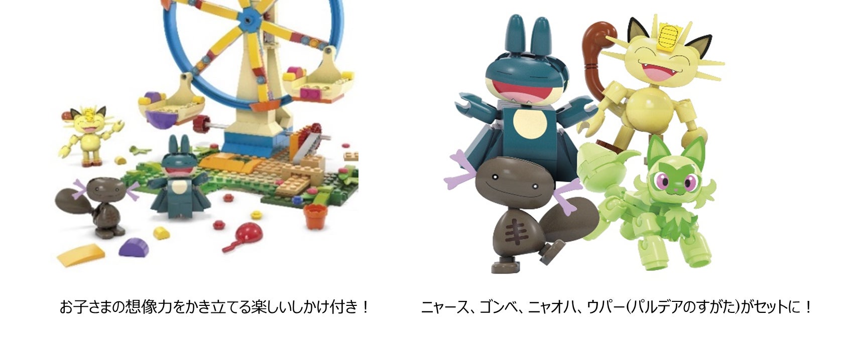 ✓ ワクワク観覧車のブロックセットでは、ニャース・ゴンべ・ニャオハ・ウパー(パルデアのすがた) をくるくる回る観覧車に乗せて楽しめる!