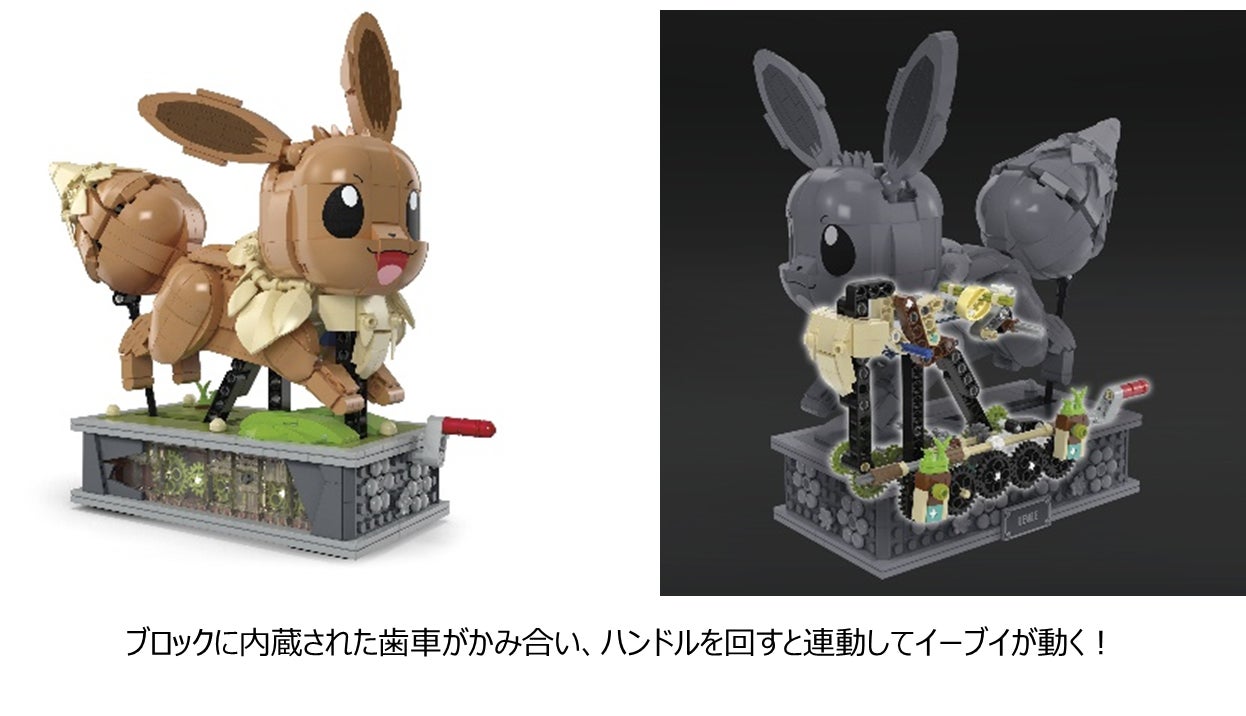 細部まで精巧に表現された長さ約21cmのイーブイを組み立てられるブロックセット。草原が再現されたディスプレイ台付きです。組み立て後は、ハンドルを回すと、イーブイの足やしっぽが動いて、草原の上を走るキュートなアクションを楽しめます。合計1371ピースが含まれています。