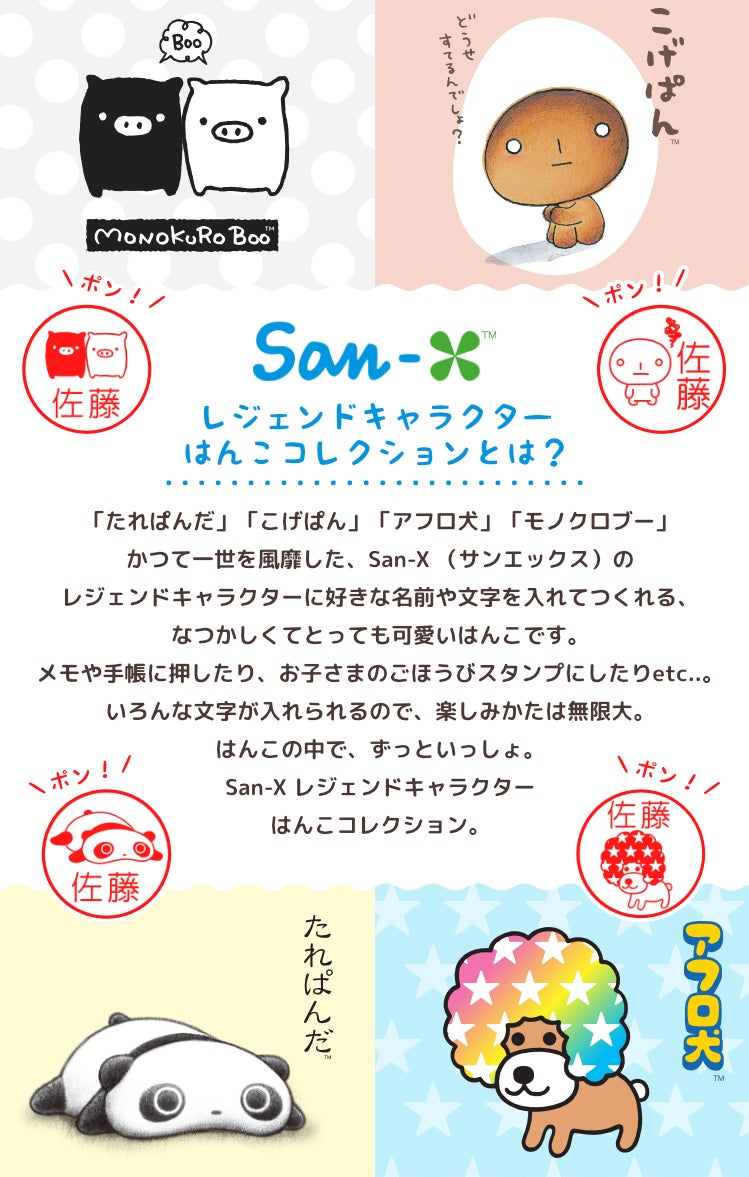 「San-X レジェンドキャラクター はんこコレクション」は、1990年代~2000年代にかつて一世を風靡した、San-X (サンエックス)のレジェンドキャラクターである「たれぱんだ」「こげぱん」「アフロ犬」「モノクロブー」の懐かしくてかわいいキャラクターに好きな名前や文字を入れてつくれるオリジナルはんこ。